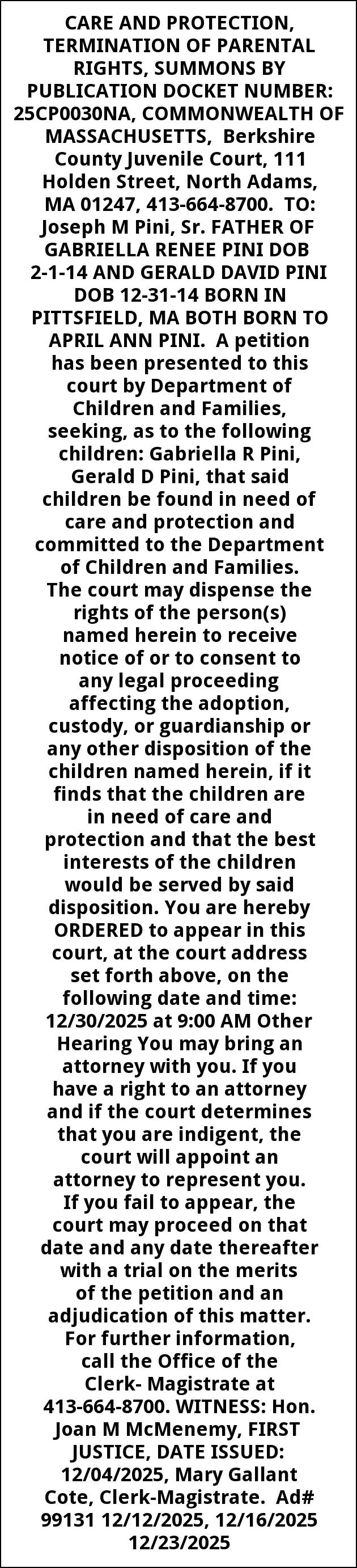 CARE AND PROTECTION, TERMINATION OF PARENTAL RIGHTS, SUMMONS BY PUBLICATION DOCKET NUMBER: 25CP0030NA, COMMONWEALTH OF MASSACHUSETTS, Berkshire County Juvenile Court, 111 Holden Street, North Adams, MA 01247, 413-664-8700. TO: Joseph M Pini, Sr. FATHER OF GABRIELLA RENEE PINI DOB 2-1-14 AND GERALD DAVID PINI DOB 12-31-14 BORN IN PITTSFIELD, MA BOTH BORN TO APRIL ANN PINI. A petition has been presented to this court by Department of Children and Families, seeking, as to the following children: Gabriella R Pini, Gerald D Pini, that said children be found in need of care and protection and committed to the Department of Children and Families. The court may dispense the rights of the person(s) named herein to receive notice of or to consent to any legal proceeding affecting the adoption, custody, or guardianship or any other disposition of the children named herein, if it finds that the children are in need of care and protection and that the best interests of the children would be served by said disposition. You are hereby ORDERED to appear in this court, at the court address set forth above, on the following date and time: 12/30/2025 at 9:00 AM Other Hearing You may bring an attorney with you. If you have a right to an attorney and if the court determines that you are indigent, the court will appoint an attorney to represent you. If you fail to appear, the court may proceed on that date and any date thereafter with a trial on the merits of the petition and an adjudication of this matter. For further information, call the Office of the Clerk- Magistrate at 413-664-8700. WITNESS: Hon. Joan M McMenemy, FIRST JUSTICE, DATE ISSUED: 12/04/2025, Mary Gallant Cote, Clerk-Magistrate. Ad# 99131 12/12/2025, 12/16/2025 12/23/2025