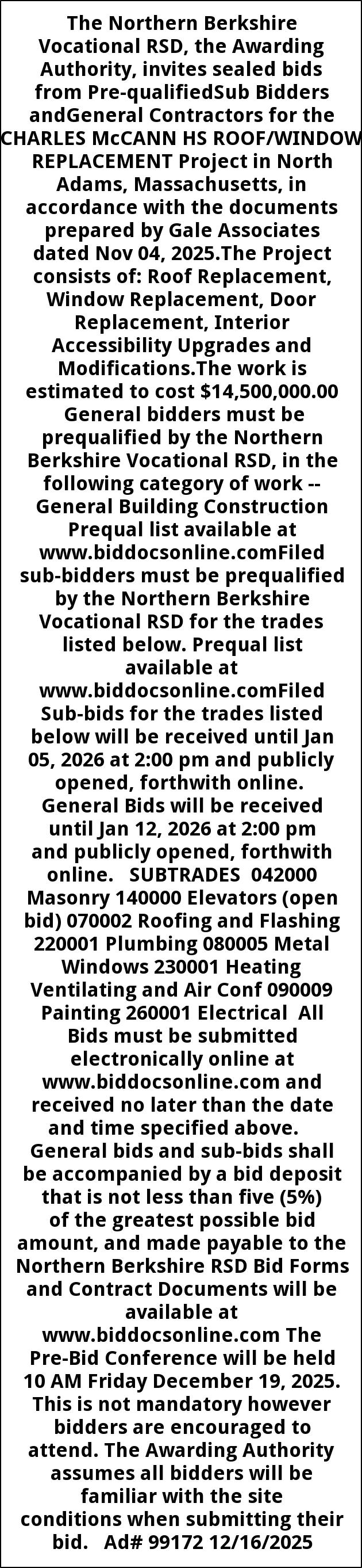 The Northern Berkshire Vocational RSD, the Awarding Authority, invites sealed bids from Pre-qualifiedSub Bidders andGeneral Contractors for the CHARLES McCANN HS ROOF/WINDOW REPLACEMENT Project in North Adams, Massachusetts, in accordance with the documents prepared by Gale Associates dated Nov 04, 2025.The Project consists of: Roof Replacement, Window Replacement, Door Replacement, Interior Accessibility Upgrades and Modifications.The work is estimated to cost $14,500,000.00 General bidders must be prequalified by the Northern Berkshire Vocational RSD, in the following category of work -- General Building Construction Prequal list available at www.biddocsonline.comFiled sub-bidders must be prequalified by the Northern Berkshire Vocational RSD for the trades listed below. Prequal list available at www.biddocsonline.comFiled Sub-bids for the trades listed below will be received until Jan 05, 2026 at 2:00 pm and publicly opened, forthwith online. General Bids will be received until Jan 12, 2026 at 2:00 pm and publicly opened, forthwith online. SUBTRADES 042000 Masonry 140000 Elevators (open bid) 070002 Roofing and Flashing 220001 Plumbing 080005 Metal Windows 230001 Heating Ventilating and Air Conf 090009 Painting 260001 Electrical All Bids must be submitted electronically online at www.biddocsonline.com and received no later than the date and time specified above. General bids and sub-bids shall be accompanied by a bid deposit that is not less than five (5%) of the greatest possible bid amount, and made payable to the Northern Berkshire RSD Bid Forms and Contract Documents will be available at www.biddocsonline.com The Pre-Bid Conference will be held 10 AM Friday December 19, 2025. This is not mandatory however bidders are encouraged to attend. The Awarding Authority assumes all bidders will be familiar with the site conditions when submitting their bid. Ad# 99172 12/16/2025
