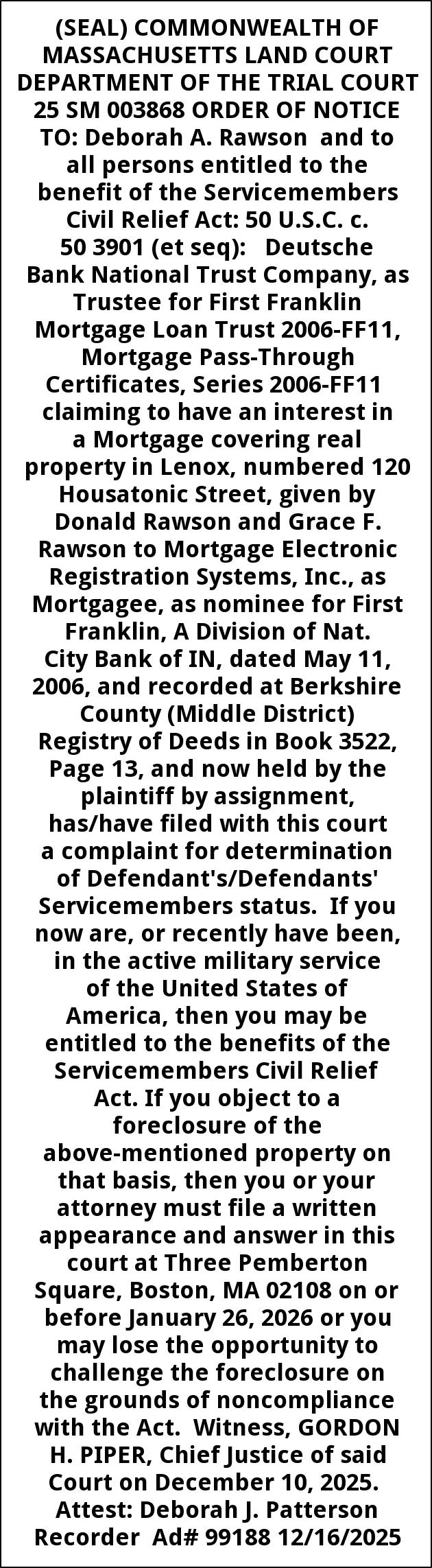 (SEAL) COMMONWEALTH OF MASSACHUSETTS LAND COURT DEPARTMENT OF THE TRIAL COURT 25 SM 003868 ORDER OF NOTICE TO: Deborah A. Rawson and to all persons entitled to the benefit of the Servicemembers Civil Relief Act: 50 U.S.C. c. 50 3901 (et seq): Deutsche Bank National Trust Company, as Trustee for First Franklin Mortgage Loan Trust 2006-FF11, Mortgage Pass-Through Certificates, Series 2006-FF11 claiming to have an interest in a Mortgage covering real property in Lenox, numbered 120 Housatonic Street, given by Donald Rawson and Grace F. Rawson to Mortgage Electronic Registration Systems, Inc., as Mortgagee, as nominee for First Franklin, A Division of Nat. City Bank of IN, dated May 11, 2006, and recorded at Berkshire County (Middle District) Registry of Deeds in Book 3522, Page 13, and now held by the plaintiff by assignment, has/have filed with this court a complaint for determination of Defendant's/Defendants' Servicemembers status. If you now are, or recently have been, in the active military service of the United States of America, then you may be entitled to the benefits of the Servicemembers Civil Relief Act. If you object to a foreclosure of the above-mentioned property on that basis, then you or your attorney must file a written appearance and answer in this court at Three Pemberton Square, Boston, MA 02108 on or before January 26, 2026 or you may lose the opportunity to challenge the foreclosure on the grounds of noncompliance with the Act. Witness, GORDON H. PIPER, Chief Justice of said Court on December 10, 2025. Attest: Deborah J. Patterson Recorder Ad# 99188 12/16/2025