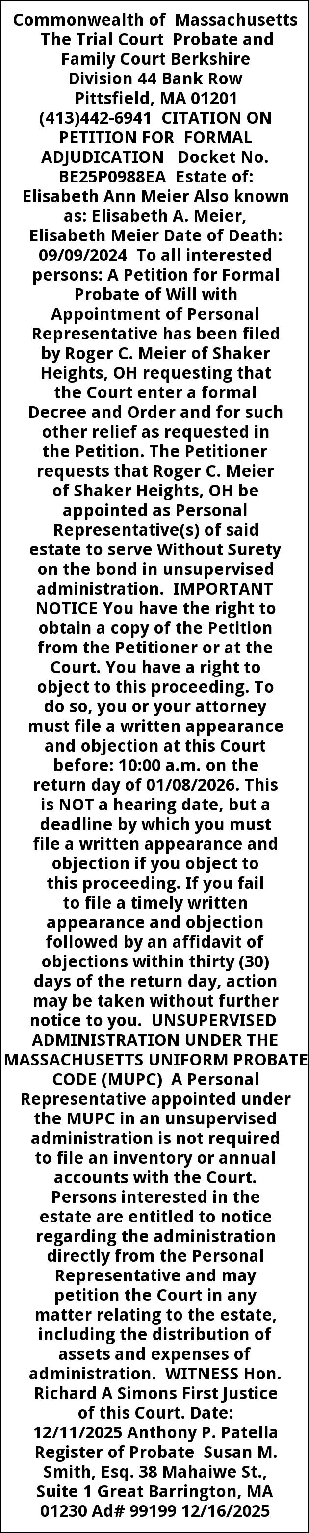Commonwealth of Massachusetts The Trial Court Probate and Family Court Berkshire Division 44 Bank Row Pittsfield, MA 01201 (413)442-6941 CITATION ON PETITION FOR FORMAL ADJUDICATION Docket No. BE25P0988EA Estate of: Elisabeth Ann Meier Also known as: Elisabeth A. Meier, Elisabeth Meier Date of Death: 09/09/2024 To all interested persons: A Petition for Formal Probate of Will with Appointment of Personal Representative has been filed by Roger C. Meier of Shaker Heights, OH requesting that the Court enter a formal Decree and Order and for such other relief as requested in the Petition. The Petitioner requests that Roger C. Meier of Shaker Heights, OH be appointed as Personal Representative(s) of said estate to serve Without Surety on the bond in unsupervised administration. IMPORTANT NOTICE You have the right to obtain a copy of the Petition from the Petitioner or at the Court. You have a right to object to this proceeding. To do so, you or your attorney must file a written appearance and objection at this Court before: 10:00 a.m. on the return day of 01/08/2026. This is NOT a hearing date, but a deadline by which you must file a written appearance and objection if you object to this proceeding. If you fail to file a timely written appearance and objection followed by an affidavit of objections within thirty (30) days of the return day, action may be taken without further notice to you. UNSUPERVISED ADMINISTRATION UNDER THE MASSACHUSETTS UNIFORM PROBATE CODE (MUPC) A Personal Representative appointed under the MUPC in an unsupervised administration is not required to file an inventory or annual accounts with the Court. Persons interested in the estate are entitled to notice regarding the administration directly from the Personal Representative and may petition the Court in any matter relating to the estate, including the distribution of assets and expenses of administration. WITNESS Hon. Richard A Simons First Justice of this Court. Date: 12/11/2025 Anthony P. Patella Register of Probate Susan M. Smith, Esq. 38 Mahaiwe St., Suite 1 Great Barrington, MA 01230 Ad# 99199 12/16/2025