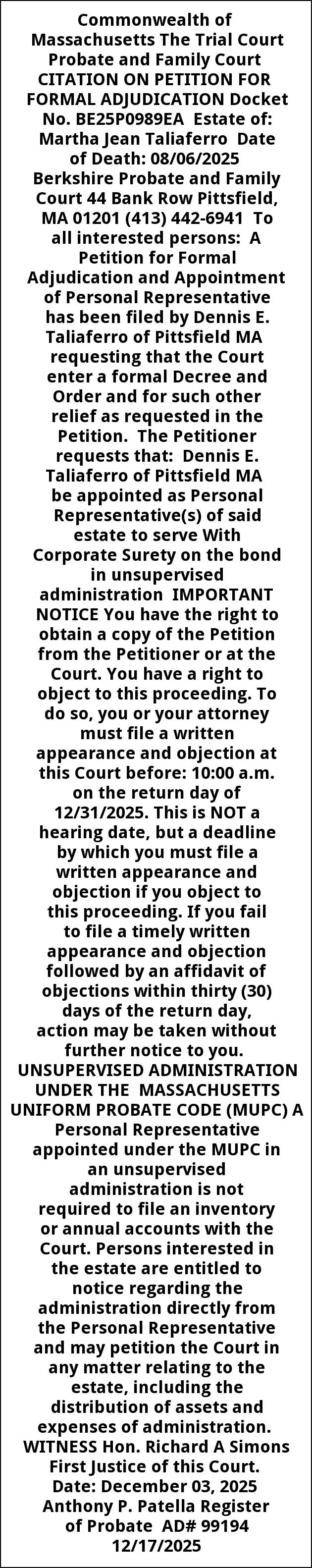 Commonwealth of Massachusetts The Trial Court Probate and Family Court CITATION ON PETITION FOR FORMAL ADJUDICATION Docket No. BE25P0989EA Estate of: Martha Jean Taliaferro Date of Death: 08/06/2025 Berkshire Probate and Family Court 44 Bank Row Pittsfield, MA 01201 (413) 442-6941 To all interested persons: A Petition for Formal Adjudication and Appointment of Personal Representative has been filed by Dennis E. Taliaferro of Pittsfield MA requesting that the Court enter a formal Decree and Order and for such other relief as requested in the Petition. The Petitioner requests that: Dennis E. Taliaferro of Pittsfield MA be appointed as Personal Representative(s) of said estate to serve With Corporate Surety on the bond in unsupervised administration IMPORTANT NOTICE You have the right to obtain a copy of the Petition from the Petitioner or at the Court. You have a right to object to this proceeding. To do so, you or your attorney must file a written appearance and objection at this Court before: 10:00 a.m. on the return day of 12/31/2025. This is NOT a hearing date, but a deadline by which you must file a written appearance and objection if you object to this proceeding. If you fail to file a timely written appearance and objection followed by an affidavit of objections within thirty (30) days of the return day, action may be taken without further notice to you. UNSUPERVISED ADMINISTRATION UNDER THE MASSACHUSETTS UNIFORM PROBATE CODE (MUPC) A Personal Representative appointed under the MUPC in an unsupervised administration is not required to file an inventory or annual accounts with the Court. Persons interested in the estate are entitled to notice regarding the administration directly from the Personal Representative and may petition the Court in any matter relating to the estate, including the distribution of assets and expenses of administration. WITNESS Hon. Richard A Simons First Justice of this Court. Date: December 03, 2025 Anthony P. Patella Register of Probate AD# 99194 12/17/2025