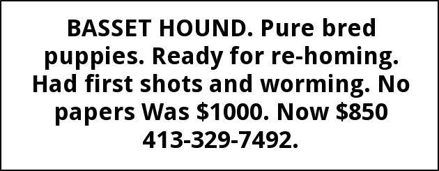 BASSET HOUND. Pure bred puppies. Ready for re-homing. Had first shots and worming. No papers Was $1000. Now $850 413-329-7492.