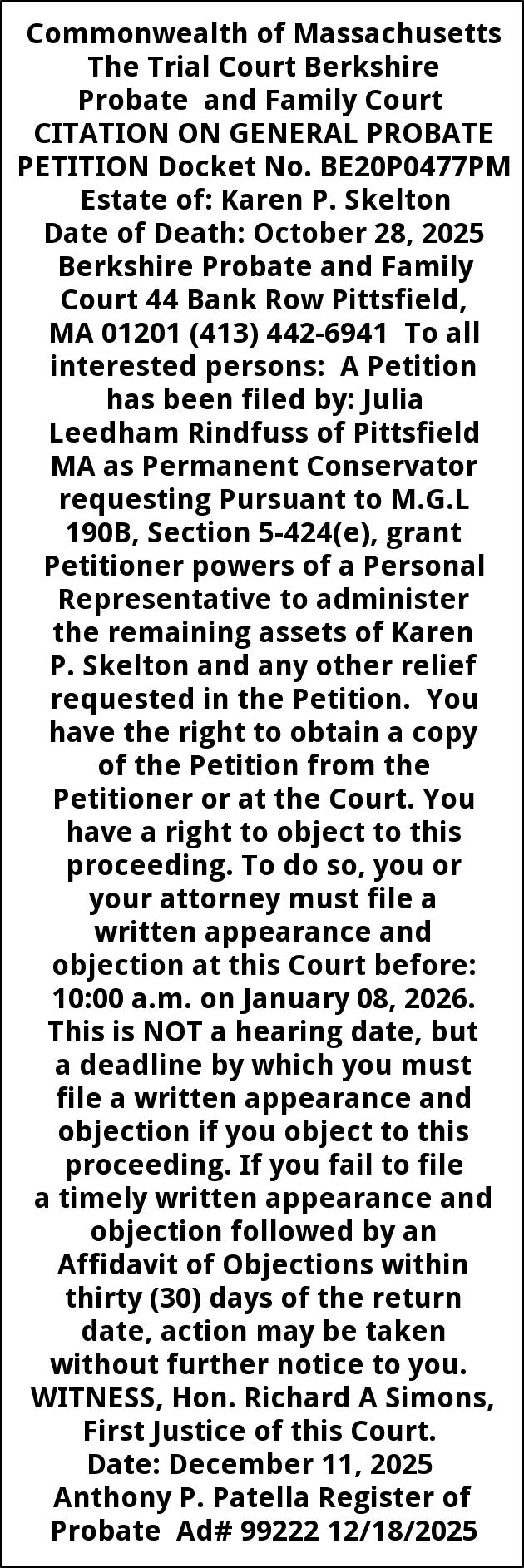 Commonwealth of Massachusetts The Trial Court Berkshire Probate and Family Court CITATION ON GENERAL PROBATE PETITION Docket No. BE20P0477PM Estate of: Karen P. Skelton Date of Death: October 28, 2025 Berkshire Probate and Family Court 44 Bank Row Pittsfield, MA 01201 (413) 442-6941 To all interested persons: A Petition has been filed by: Julia Leedham Rindfuss of Pittsfield MA as Permanent Conservator requesting Pursuant to M.G.L 190B, Section 5-424(e), grant Petitioner powers of a Personal Representative to administer the remaining assets of Karen P. Skelton and any other relief requested in the Petition. You have the right to obtain a copy of the Petition from the Petitioner or at the Court. You have a right to object to this proceeding. To do so, you or your attorney must file a written appearance and objection at this Court before: 10:00 a.m. on January 08, 2026. This is NOT a hearing date, but a deadline by which you must file a written appearance and objection if you object to this proceeding. If you fail to file a timely written appearance and objection followed by an Affidavit of Objections within thirty (30) days of the return date, action may be taken without further notice to you. WITNESS, Hon. Richard A Simons, First Justice of this Court. Date: December 11, 2025 Anthony P. Patella Register of Probate Ad# 99222 12/18/2025