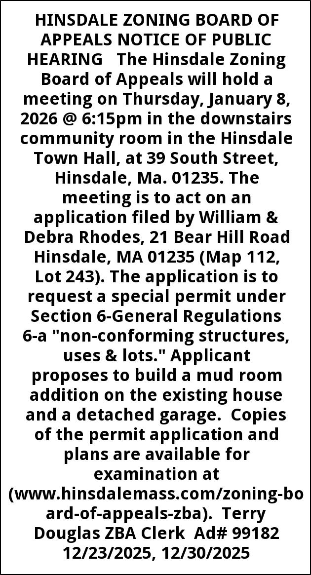 HINSDALE ZONING BOARD OF APPEALS NOTICE OF PUBLIC HEARING The Hinsdale Zoning Board of Appeals will hold a meeting on Thursday, January 8, 2026 @ 6:15pm in the downstairs community room in the Hinsdale Town Hall, at 39 South Street, Hinsdale, Ma. 01235. The meeting is to act on an application filed by William & Debra Rhodes, 21 Bear Hill Road Hinsdale, MA 01235 (Map 112, Lot 243). The application is to request a special permit under Section 6-General Regulations 6-a "non-conforming structures, uses & lots." Applicant proposes to build a mud room addition on the existing house and a detached garage. Copies of the permit application and plans are available for examination at (www.hinsdalemass.com/zoning-board-of-appeals-zba). Terry Douglas ZBA Clerk Ad# 99182 12/23/2025, 12/30/2025