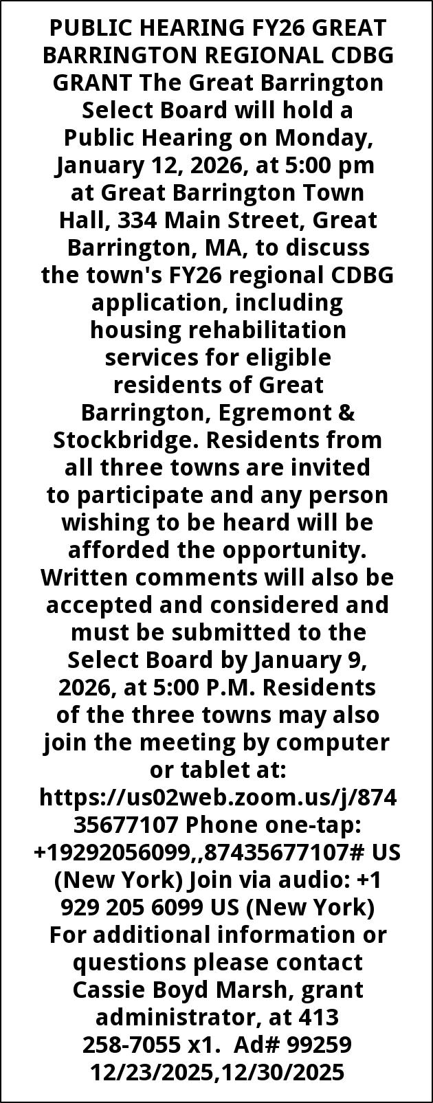 PUBLIC HEARING FY26 GREAT BARRINGTON REGIONAL CDBG GRANT The Great Barrington Select Board will hold a Public Hearing on Monday, January 12, 2026, at 5:00 pm at Great Barrington Town Hall, 334 Main Street, Great Barrington, MA, to discuss the town's FY26 regional CDBG application, including housing rehabilitation services for eligible residents of Great Barrington, Egremont & Stockbridge. Residents from all three towns are invited to participate and any person wishing to be heard will be afforded the opportunity. Written comments will also be accepted and considered and must be submitted to the Select Board by January 9, 2026, at 5:00 P.M. Residents of the three towns may also join the meeting by computer or tablet at: https://us02web.zoom.us/j/87435677107 Phone one-tap: +19292056099,,87435677107# US (New York) Join via audio: +1 929 205 6099 US (New York) For additional information or questions please contact Cassie Boyd Marsh, grant administrator, at 413 258-7055 x1. Ad# 99259 12/23/2025,12/30/2025