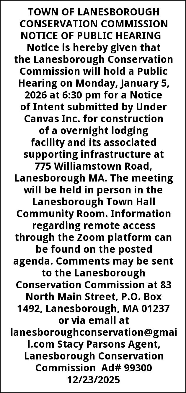 TOWN OF LANESBOROUGH CONSERVATION COMMISSION NOTICE OF PUBLIC HEARING Notice is hereby given that the Lanesborough Conservation Commission will hold a Public Hearing on Monday, January 5, 2026 at 6:30 pm for a Notice of Intent submitted by Under Canvas Inc. for construction of a overnight lodging facility and its associated supporting infrastructure at 775 Williamstown Road, Lanesborough MA. The meeting will be held in person in the Lanesborough Town Hall Community Room. Information regarding remote access through the Zoom platform can be found on the posted agenda. Comments may be sent to the Lanesborough Conservation Commission at 83 North Main Street, P.O. Box 1492, Lanesborough, MA 01237 or via email at lanesboroughconservation@gmail.com Stacy Parsons Agent, Lanesborough Conservation Commission Ad# 99300 12/23/2025