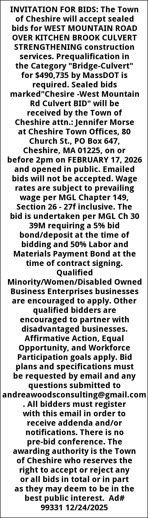 INVITATION FOR BIDS: The Town of Cheshire will accept sealed bids for WEST MOUNTAIN ROAD OVER KITCHEN BROOK CULVERT STRENGTHENING construction services. Prequalification in the Category "Bridge-Culvert" for $490,735 by MassDOT is required. Sealed bids marked"Chesire -West Mountain Rd Culvert BID" will be received by the Town of Cheshire attn.: Jennifer Morse at Cheshire Town Offices, 80 Church St., PO Box 647, Cheshire, MA 01225, on or before 2pm on FEBRUARY 17, 2026 and opened in public. Emailed bids will not be accepted. Wage rates are subject to prevailing wage per MGL Chapter 149, Section 26 - 27f inclusive. The bid is undertaken per MGL Ch 30 39M requiring a 5% bid bond/deposit at the time of bidding and 50% Labor and Materials Payment Bond at the time of contract signing. Qualified Minority/Women/Disabled Owned Business Enterprises businesses are encouraged to apply. Other qualified bidders are encouraged to partner with disadvantaged businesses. Affirmative Action, Equal Opportunity, and Workforce Participation goals apply. Bid plans and specifications must be requested by email and any questions submitted to andreawoodsconsulting@gmail.com. All bidders must register with this email in order to receive addenda and/or notifications. There is no pre-bid conference. The awarding authority is the Town of Cheshire who reserves the right to accept or reject any or all bids in total or in part as they may deem to be in the best public interest. Ad# 99331 12/24/2025
