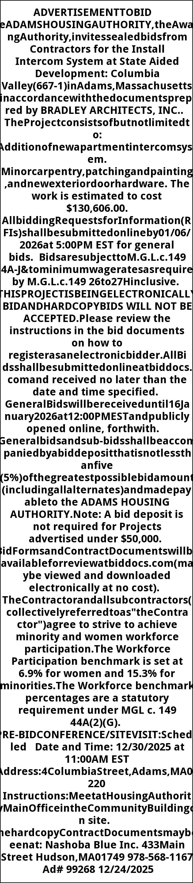 ADVERTISEMENTTOBID TheADAMSHOUSINGAUTHORITY,theAwardingAuthority,invitessealedbidsfrom Contractors for the Install Intercom System at State Aided Development: Columbia Valley(667-1)inAdams,Massachusetts,inaccordancewiththedocumentsprepared by BRADLEY ARCHITECTS, INC.. TheProjectconsistsofbutnotlimitedto: Additionofnewapartmentintercomsystem. Minorcarpentry,patchingandpainting,andnewexteriordoorhardware. The work is estimated to cost $130,606.00. AllbiddingRequestsforInformation(RFIs)shallbesubmittedonlineby01/06/2026at 5:00PM EST for general bids. BidsaresubjecttoM.G.L.c.149 44A-J&tominimumwageratesasrequiredby M.G.L.c.149 26to27Hinclusive. THISPROJECTISBEINGELECTRONICALLY BIDANDHARDCOPYBIDS WILL NOT BE ACCEPTED.Please review the instructions in the bid documents on how to registerasanelectronicbidder.AllBidsshallbesubmittedonlineatbiddocs.comand received no later than the date and time specified. GeneralBidswillbereceiveduntil16January2026at12:00PMESTandpublicly opened online, forthwith. Generalbidsandsub-bidsshallbeaccompaniedbyabiddepositthatisnotlessthanfive (5%)ofthegreatestpossiblebidamount(includingallalternates)andmadepayableto the ADAMS HOUSING AUTHORITY.Note: A bid deposit is not required for Projects advertised under $50,000. BidFormsandContractDocumentswillbeavailableforreviewatbiddocs.com(maybe viewed and downloaded electronically at no cost). TheContractorandallsubcontractors(collectivelyreferredtoas"theContractor")agree to strive to achieve minority and women workforce participation.The Workforce Participation benchmark is set at 6.9% for women and 15.3% for minorities.The Workforce benchmark percentages are a statutory requirement under MGL c. 149 44A(2)(G). PRE-BIDCONFERENCE/SITEVISIT:Scheduled Date and Time: 12/30/2025 at 11:00AM EST Address:4ColumbiaStreet,Adams,MA01220 Instructions:MeetatHousingAuthorityMainOfficeintheCommunityBuildingon site. ThehardcopyContractDocumentsmaybeseenat: Nashoba Blue Inc. 433Main Street Hudson,MA01749 978-568-1167 Ad# 99268 12/24/2025