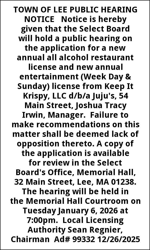 TOWN OF LEE PUBLIC HEARING NOTICE Notice is hereby given that the Select Board will hold a public hearing on the application for a new annual all alcohol restaurant license and new annual entertainment (Week Day & Sunday) license from Keep It Krispy, LLC d/b/a Juju's, 54 Main Street, Joshua Tracy Irwin, Manager. Failure to make recommendations on this matter shall be deemed lack of opposition thereto. A copy of the application is available for review in the Select Board's Office, Memorial Hall, 32 Main Street, Lee, MA 01238. The hearing will be held in the Memorial Hall Courtroom on Tuesday January 6, 2026 at 7:00pm. Local Licensing Authority Sean Regnier, Chairman Ad# 99332 12/26/2025