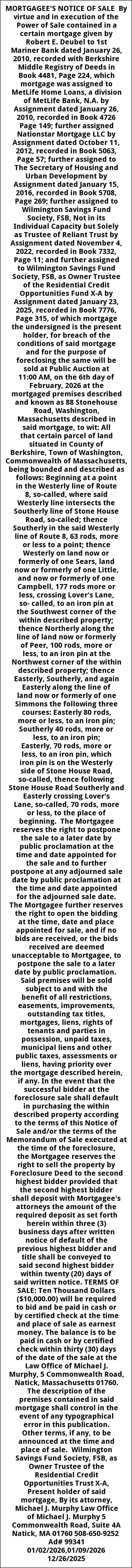 MORTGAGEE'S NOTICE OF SALE By virtue and in execution of the Power of Sale contained in a certain mortgage given by Robert E. Deubel to 1st Mariner Bank dated January 26, 2010, recorded with Berkshire Middle Registry of Deeds in Book 4481, Page 224, which mortgage was assigned to MetLife Home Loans, a division of MetLife Bank, N.A. by Assignment dated January 26, 2010, recorded in Book 4726 Page 149; further assigned Nationstar Mortgage LLC by Assignment dated October 11, 2012, recorded in Book 5063, Page 57; further assigned to The Secretary of Housing and Urban Development by Assignment dated January 15, 2016, recorded in Book 5708, Page 269; further assigned to Wilmington Savings Fund Society, FSB, Not in its Individual Capacity but Solely as Trustee of Reliant Trust by Assignment dated November 4, 2022, recorded in Book 7332, Page 11; and further assigned to Wilmington Savings Fund Society, FSB, as Owner Trustee of the Residential Credit Opportunities Fund X-A by Assignment dated January 23, 2025, recorded in Book 7776, Page 315, of which mortgage the undersigned is the present holder, for breach of the conditions of said mortgage and for the purpose of foreclosing the same will be sold at Public Auction at 11:00 AM, on the 6th day of February, 2026 at the mortgaged premises described and known as 88 Stonehouse Road, Washington, Massachusetts described in said mortgage, to wit: All that certain parcel of land situated in County of Berkshire, Town of Washington, Commonwealth of Massachusetts, being bounded and described as follows: Beginning at a point in the Westerly line of Route 8, so-called, where said Westerly line intersects the Southerly line of Stone House Road, so-called; thence Southerly in the said Westerly line of Route 8, 63 rods, more or less to a point; thence Westerly on land now or formerly of one Sears, land now or formerly of one Little, and now or formerly of one Campbell, 177 rods more or less, crossing Lover's Lane, so- called, to an iron pin at the Southwest corner of the within described property; thence Northerly along the line of land now or formerly of Peer, 100 rods, more or less, to an iron pin at the Northwest corner of the within described property; thence Easterly, Southerly, and again Easterly along the line of land now or formerly of one Simmons the following three courses: Easterly 80 rods, more or less, to an iron pin; Southerly 40 rods, more or less, to an iron pin; Easterly, 70 rods, more or less, to an iron pin, which iron pin is on the Westerly side of Stone House Road, so-called, thence following Stone House Road Southerly and Easterly crossing Lover's Lane, so-called, 70 rods, more or less, to the place of beginning. The Mortgagee reserves the right to postpone the sale to a later date by public proclamation at the time and date appointed for the sale and to further postpone at any adjourned sale date by public proclamation at the time and date appointed for the adjourned sale date. The Mortgagee further reserves the right to open the bidding at the time, date and place appointed for sale, and if no bids are received, or the bids received are deemed unacceptable to Mortgagee, to postpone the sale to a later date by public proclamation. Said premises will be sold subject to and with the benefit of all restrictions, easements, improvements, outstanding tax titles, mortgages, liens, rights of tenants and parties in possession, unpaid taxes, municipal liens and other public taxes, assessments or liens, having priority over the mortgage described herein, if any. In the event that the successful bidder at the foreclosure sale shall default in purchasing the within described property according to the terms of this Notice of Sale and/or the terms of the Memorandum of Sale executed at the time of the foreclosure, the Mortgagee reserves the right to sell the property by Foreclosure Deed to the second highest bidder provided that the second highest bidder shall deposit with Mortgagee's attorneys the amount of the required deposit as set forth herein within three (3) business days after written notice of default of the previous highest bidder and title shall be conveyed to said second highest bidder within twenty (20) days of said written notice. TERMS OF SALE: Ten Thousand Dollars ($10,000.00) will be required to bid and be paid in cash or by certified check at the time and place of sale as earnest money. The balance is to be paid in cash or by certified check within thirty (30) days of the date of the sale at the Law Office of Michael J. Murphy, 5 Commonwealth Road, Natick, Massachusetts 01760. The description of the premises contained in said mortgage shall control in the event of any typographical error in this publication. Other terms, if any, to be announced at the time and place of sale. Wilmington Savings Fund Society, FSB, as Owner Trustee of the Residential Credit Opportunities Trust X-A, Present holder of said mortgage, By its attorney, Michael J. Murphy Law Office of Michael J. Murphy 5 Commonwealth Road, Suite 4A Natick, MA 01760 508-650-9252 Ad# 99341 01/02/2026,01/09/2026 12/26/2025