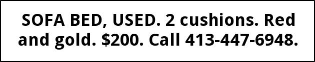 SOFA BED, USED. 2 cushions. Red and gold. $200. Call 413-447-6948.