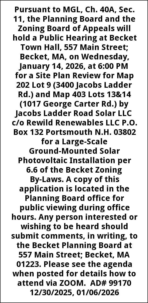 Pursuant to MGL, Ch. 40A, Sec. 11, the Planning Board and the Zoning Board of Appeals will hold a Public Hearing at Becket Town Hall, 557 Main Street; Becket, MA, on Wednesday, January 14, 2026, at 6:00 PM for a Site Plan Review for Map 202 Lot 9 (3400 Jacobs Ladder Rd.) and Map 403 Lots 13&14 (1017 George Carter Rd.) by Jacobs Ladder Road Solar LLC c/o Rewild Renewables LLC P.O. Box 132 Portsmouth N.H. 03802 for a Large-Scale Ground-Mounted Solar Photovoltaic Installation per 6.6 of the Becket Zoning By-Laws. A copy of this application is located in the Planning Board office for public viewing during office hours. Any person interested or wishing to be heard should submit comments, in writing, to the Becket Planning Board at 557 Main Street; Becket, MA 01223. Please see the agenda when posted for details how to attend via ZOOM. AD# 99170 12/30/2025, 01/06/2026