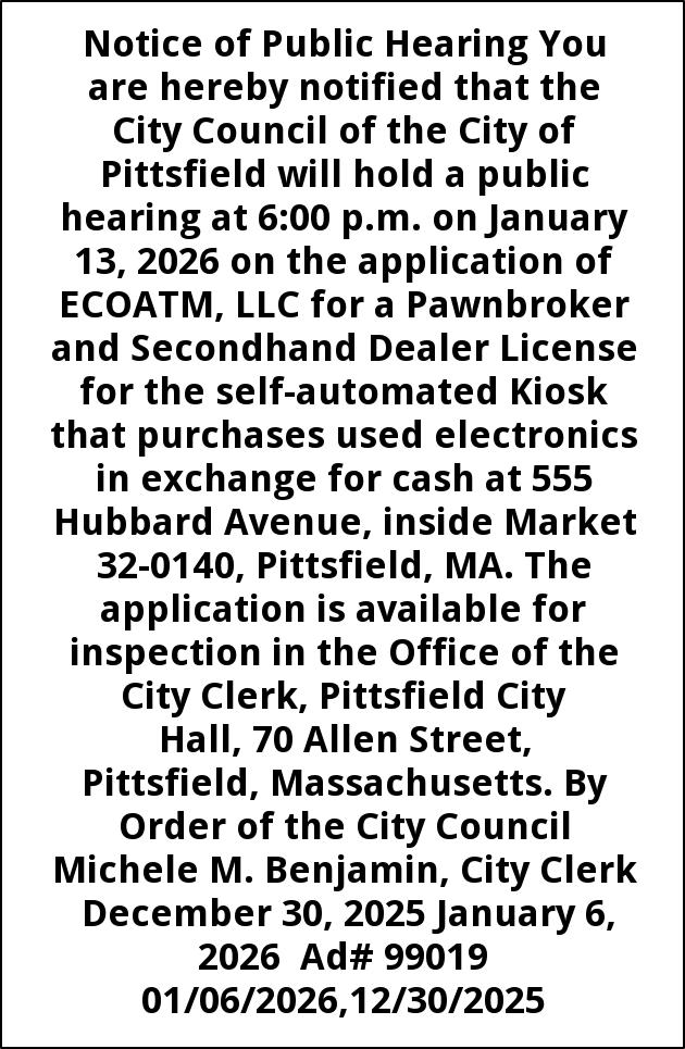 Notice of Public Hearing You are hereby notified that the City Council of the City of Pittsfield will hold a public hearing at 6:00 p.m. on January 13, 2026 on the application of ECOATM, LLC for a Pawnbroker and Secondhand Dealer License for the self-automated Kiosk that purchases used electronics in exchange for cash at 555 Hubbard Avenue, inside Market 32-0140, Pittsfield, MA. The application is available for inspection in the Office of the City Clerk, Pittsfield City Hall, 70 Allen Street, Pittsfield, Massachusetts. By Order of the City Council Michele M. Benjamin, City Clerk December 30, 2025 January 6, 2026 Ad# 99019 01/06/2026,12/30/2025