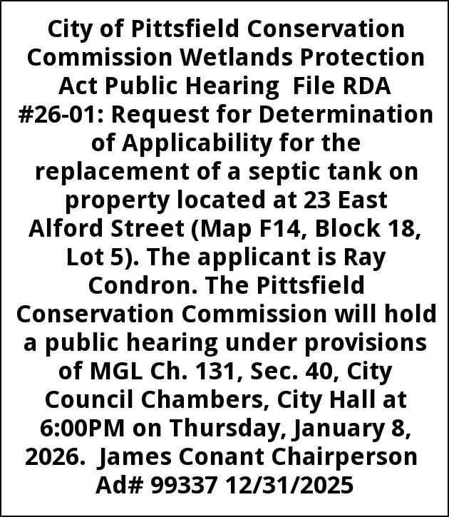 City of Pittsfield Conservation Commission Wetlands Protection Act Public Hearing File RDA #26-01: Request for Determination of Applicability for the replacement of a septic tank on property located at 23 East Alford Street (Map F14, Block 18, Lot 5). The applicant is Ray Condron. The Pittsfield Conservation Commission will hold a public hearing under provisions of MGL Ch. 131, Sec. 40, City Council Chambers, City Hall at 6:00PM on Thursday, January 8, 2026. James Conant Chairperson Ad# 99337 12/31/2025