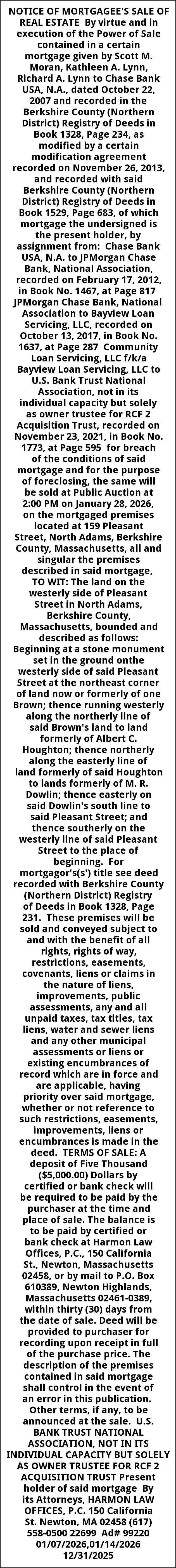 NOTICE OF MORTGAGEE'S SALE OF REAL ESTATE By virtue and in execution of the Power of Sale contained in a certain mortgage given by Scott M. Moran, Kathleen A. Lynn, Richard A. Lynn to Chase Bank USA, N.A., dated October 22, 2007 and recorded in the Berkshire County (Northern District) Registry of Deeds in Book 1328, Page 234, as modified by a certain modification agreement recorded on November 26, 2013, and recorded with said Berkshire County (Northern District) Registry of Deeds in Book 1529, Page 683, of which mortgage the undersigned is the present holder, by assignment from: Chase Bank USA, N.A. to JPMorgan Chase Bank, National Association, recorded on February 17, 2012, in Book No. 1467, at Page 817 JPMorgan Chase Bank, National Association to Bayview Loan Servicing, LLC, recorded on October 13, 2017, in Book No. 1637, at Page 287 Community Loan Servicing, LLC f/k/a Bayview Loan Servicing, LLC to U.S. Bank Trust National Association, not in its individual capacity but solely as owner trustee for RCF 2 Acquisition Trust, recorded on November 23, 2021, in Book No. 1773, at Page 595 for breach of the conditions of said mortgage and for the purpose of foreclosing, the same will be sold at Public Auction at 2:00 PM on January 28, 2026, on the mortgaged premises located at 159 Pleasant Street, North Adams, Berkshire County, Massachusetts, all and singular the premises described in said mortgage, TO WIT: The land on the westerly side of Pleasant Street in North Adams, Berkshire County, Massachusetts, bounded and described as follows: Beginning at a stone monument set in the ground onthe westerly side of said Pleasant Street at the northeast corner of land now or formerly of one Brown; thence running westerly along the northerly line of said Brown's land to land formerly of Albert C. Houghton; thence northerly along the easterly line of land formerly of said Houghton to lands formerly of M. R. Dowlin; thence easterly on said Dowlin's south line to said Pleasant Street; and thence southerly on the westerly line of said Pleasant Street to the place of beginning. For mortgagor's(s') title see deed recorded with Berkshire County (Northern District) Registry of Deeds in Book 1328, Page 231. These premises will be sold and conveyed subject to and with the benefit of all rights, rights of way, restrictions, easements, covenants, liens or claims in the nature of liens, improvements, public assessments, any and all unpaid taxes, tax titles, tax liens, water and sewer liens and any other municipal assessments or liens or existing encumbrances of record which are in force and are applicable, having priority over said mortgage, whether or not reference to such restrictions, easements, improvements, liens or encumbrances is made in the deed. TERMS OF SALE: A deposit of Five Thousand ($5,000.00) Dollars by certified or bank check will be required to be paid by the purchaser at the time and place of sale. The balance is to be paid by certified or bank check at Harmon Law Offices, P.C., 150 California St., Newton, Massachusetts 02458, or by mail to P.O. Box 610389, Newton Highlands, Massachusetts 02461-0389, within thirty (30) days from the date of sale. Deed will be provided to purchaser for recording upon receipt in full of the purchase price. The description of the premises contained in said mortgage shall control in the event of an error in this publication. Other terms, if any, to be announced at the sale. U.S. BANK TRUST NATIONAL ASSOCIATION, NOT IN ITS INDIVIDUAL CAPACITY BUT SOLELY AS OWNER TRUSTEE FOR RCF 2 ACQUISITION TRUST Present holder of said mortgage By its Attorneys, HARMON LAW OFFICES, P.C. 150 California St. Newton, MA 02458 (617) 558-0500 22699 Ad# 99220 01/07/2026,01/14/2026 12/31/2025