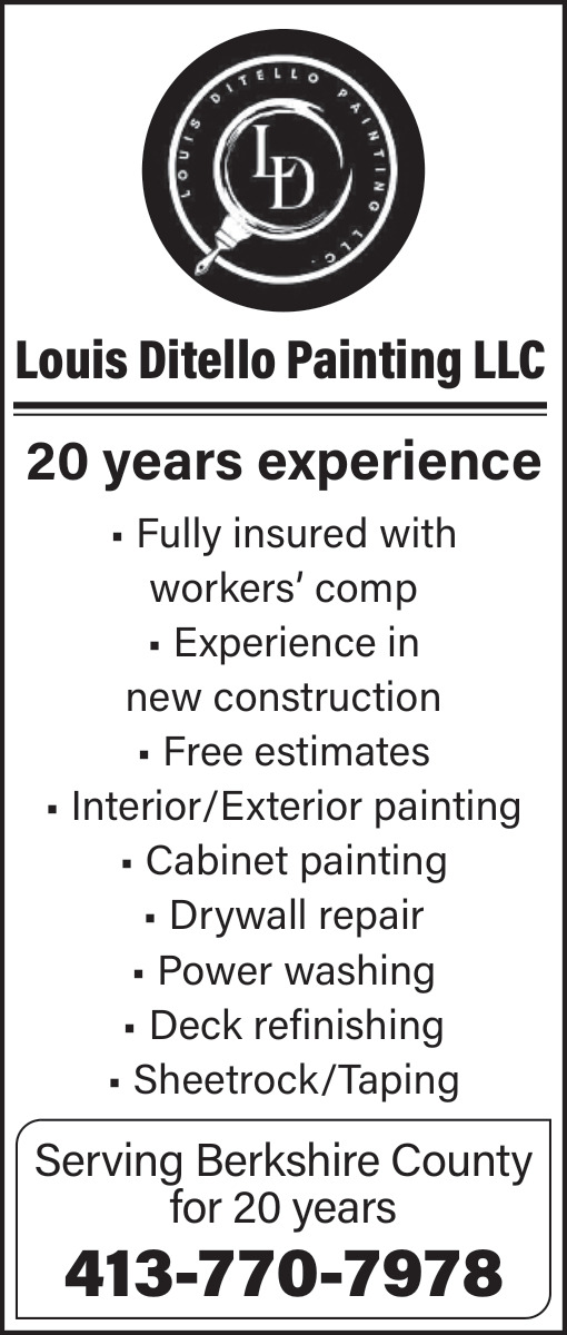 Jan 02, 2026. Louis Ditello Painting LLC Home & Garden Ads from The Berkshire Eagle ShopLocal