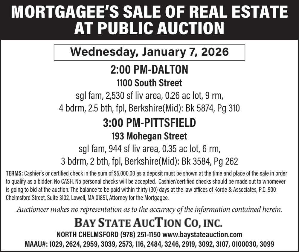 Jan 03, 2026. Bay State Auction Co, Inc Auction Ads from The Berkshire Eagle ShopLocal