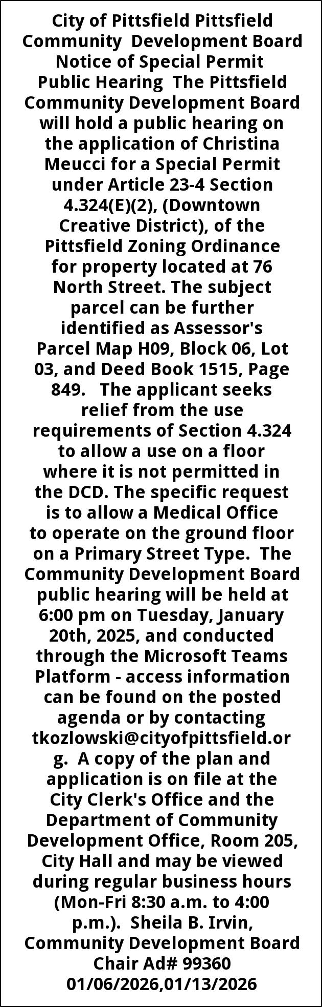 City of Pittsfield Pittsfield Community Development Board Notice of Special Permit Public Hearing The Pittsfield Community Development Board will hold a public hearing on the application of Christina Meucci for a Special Permit under Article 23-4 Section 4.324(E)(2), (Downtown Creative District), of the Pittsfield Zoning Ordinance for property located at 76 North Street. The subject parcel can be further identified as Assessor's Parcel Map H09, Block 06, Lot 03, and Deed Book 1515, Page 849. The applicant seeks relief from the use requirements of Section 4.324 to allow a use on a floor where it is not permitted in the DCD. The specific request is to allow a Medical Office to operate on the ground floor on a Primary Street Type. The Community Development Board public hearing will be held at 6:00 pm on Tuesday, January 20th, 2025, and conducted through the Microsoft Teams Platform - access information can be found on the posted agenda or by contacting tkozlowski@cityofpittsfield.org. A copy of the plan and application is on file at the City Clerk's Office and the Department of Community Development Office, Room 205, City Hall and may be viewed during regular business hours (Mon-Fri 8:30 a.m. to 4:00 p.m.). Sheila B. Irvin, Community Development Board Chair Ad# 99360 01/06/2026,01/13/2026