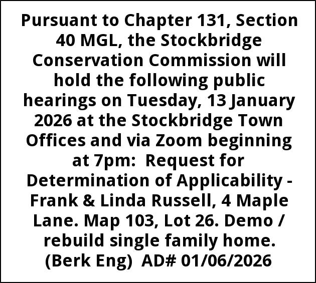 Pursuant to Chapter 131, Section 40 MGL, the Stockbridge Conservation Commission will hold the following public hearings on Tuesday, 13 January 2026 at the Stockbridge Town Offices and via Zoom beginning at 7pm: Request for Determination of Applicability - Frank & Linda Russell, 4 Maple Lane. Map 103, Lot 26. Demo / rebuild single family home. (Berk Eng) AD# 01/06/2026