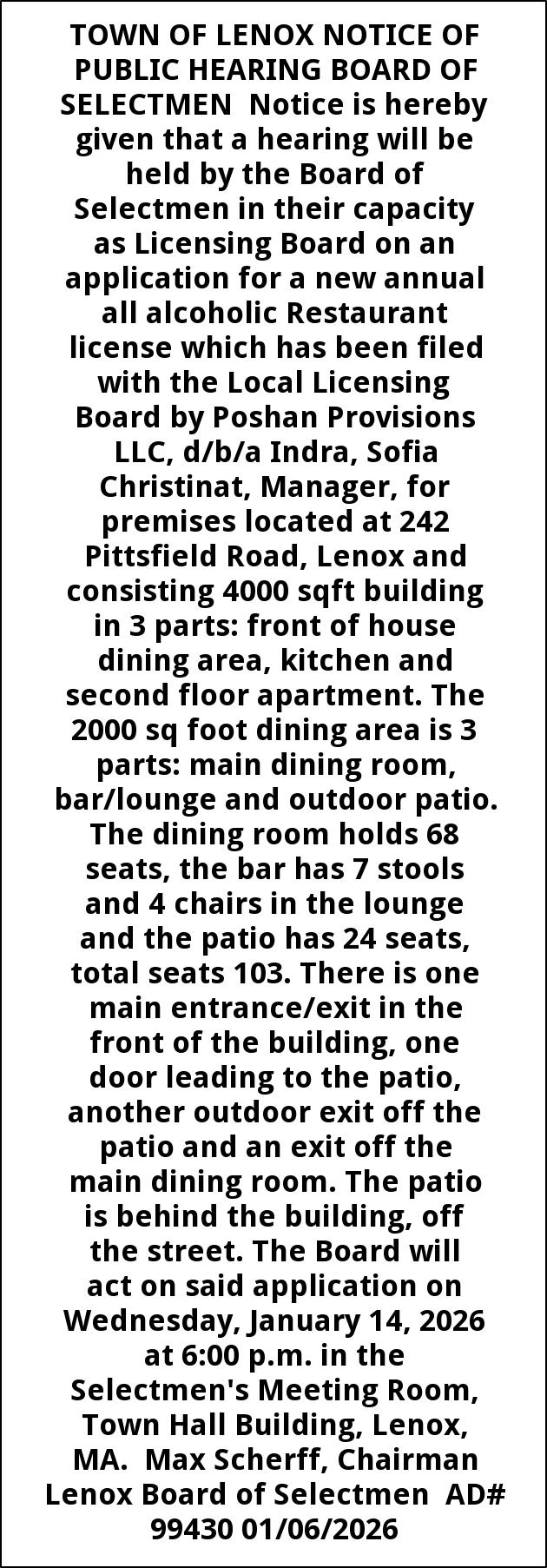 TOWN OF LENOX NOTICE OF PUBLIC HEARING BOARD OF SELECTMEN Notice is hereby given that a hearing will be held by the Board of Selectmen in their capacity as Licensing Board on an application for a new annual all alcoholic Restaurant license which has been filed with the Local Licensing Board by Poshan Provisions LLC, d/b/a Indra, Sofia Christinat, Manager, for premises located at 242 Pittsfield Road, Lenox and consisting 4000 sqft building in 3 parts: front of house dining area, kitchen and second floor apartment. The 2000 sq foot dining area is 3 parts: main dining room, bar/lounge and outdoor patio. The dining room holds 68 seats, the bar has 7 stools and 4 chairs in the lounge and the patio has 24 seats, total seats 103. There is one main entrance/exit in the front of the building, one door leading to the patio, another outdoor exit off the patio and an exit off the main dining room. The patio is behind the building, off the street. The Board will act on said application on Wednesday, January 14, 2026 at 6:00 p.m. in the Selectmen's Meeting Room, Town Hall Building, Lenox, MA. Max Scherff, Chairman Lenox Board of Selectmen AD# 99430 01/06/2026
