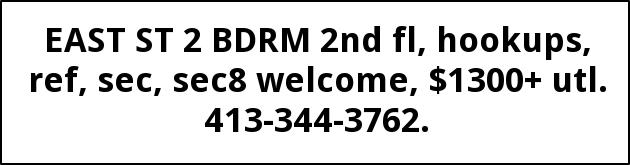 EAST ST 2 BDRM 2nd fl, hookups, ref, sec, sec8 welcome, $1300+ utl. 413-344-3762.