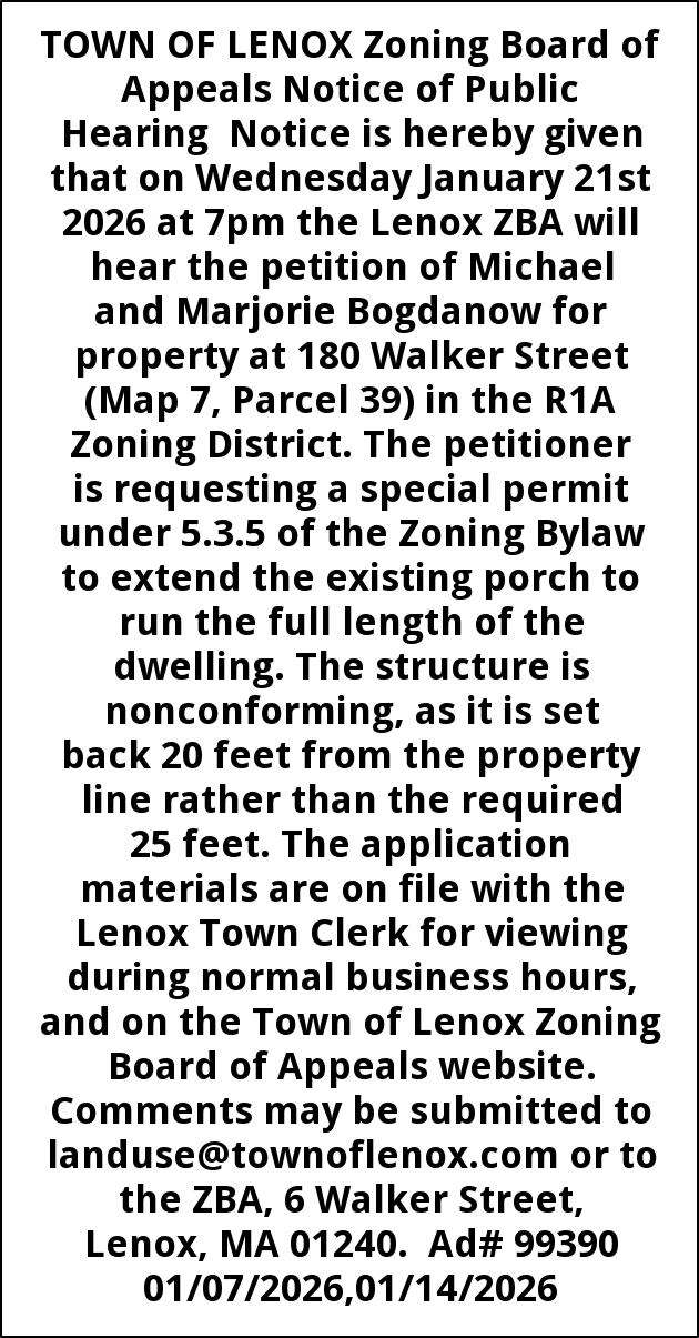 TOWN OF LENOX Zoning Board of Appeals Notice of Public Hearing Notice is hereby given that on Wednesday January 21st 2026 at 7pm the Lenox ZBA will hear the petition of Michael and Marjorie Bogdanow for property at 180 Walker Street (Map 7, Parcel 39) in the R1A Zoning District. The petitioner is requesting a special permit under 5.3.5 of the Zoning Bylaw to extend the existing porch to run the full length of the dwelling. The structure is nonconforming, as it is set back 20 feet from the property line rather than the required 25 feet. The application materials are on file with the Lenox Town Clerk for viewing during normal business hours, and on the Town of Lenox Zoning Board of Appeals website. Comments may be submitted to landuse@townoflenox.com or to the ZBA, 6 Walker Street, Lenox, MA 01240. Ad# 99390 01/07/2026,01/14/2026