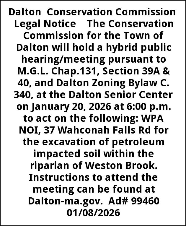 Dalton Conservation Commission Legal Notice The Conservation Commission for the Town of Dalton will hold a hybrid public hearing/meeting pursuant to M.G.L. Chap.131, Section 39A & 40, and Dalton Zoning Bylaw C. 340, at the Dalton Senior Center on January 20, 2026 at 6:00 p.m. to act on the following: WPA NOI, 37 Wahconah Falls Rd for the excavation of petroleum impacted soil within the riparian of Weston Brook. Instructions to attend the meeting can be found at Dalton-ma.gov. Ad# 99460 01/08/2026