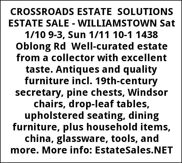 CROSSROADS ESTATE SOLUTIONS ESTATE SALE - WILLIAMSTOWN Sat 1/10 9-3, Sun 1/11 10-1 1438 Oblong Rd Well-curated estate from a collector with excellent taste. Antiques and quality furniture incl. 19th-century secretary, pine chests, Windsor chairs, drop-leaf tables, upholstered seating, dining furniture, plus household items, china, glassware, tools, and more. More info: EstateSales.NET