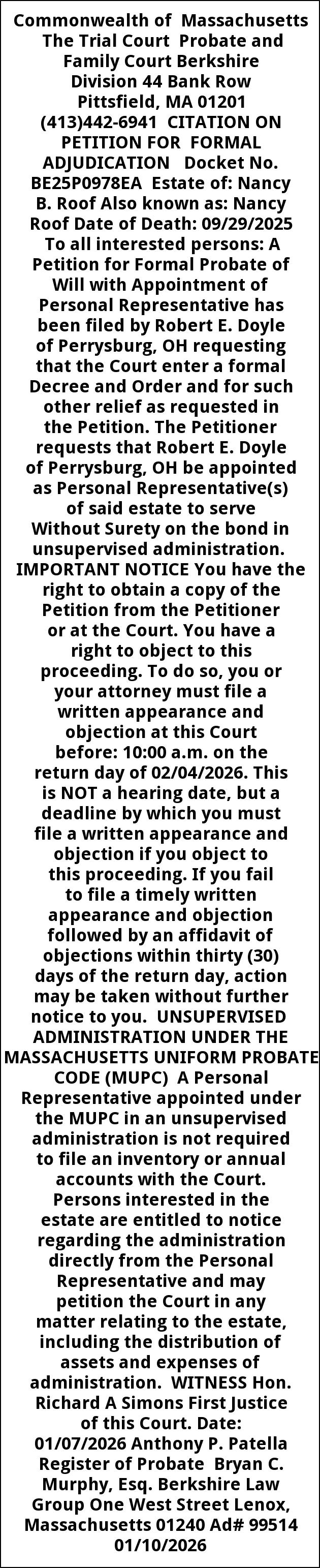 Commonwealth of Massachusetts The Trial Court Probate and Family Court Berkshire Division 44 Bank Row Pittsfield, MA 01201 (413)442-6941 CITATION ON PETITION FOR FORMAL ADJUDICATION Docket No. BE25P0978EA Estate of: Nancy B. Roof Also known as: Nancy Roof Date of Death: 09/29/2025 To all interested persons: A Petition for Formal Probate of Will with Appointment of Personal Representative has been filed by Robert E. Doyle of Perrysburg, OH requesting that the Court enter a formal Decree and Order and for such other relief as requested in the Petition. The Petitioner requests that Robert E. Doyle of Perrysburg, OH be appointed as Personal Representative(s) of said estate to serve Without Surety on the bond in unsupervised administration. IMPORTANT NOTICE You have the right to obtain a copy of the Petition from the Petitioner or at the Court. You have a right to object to this proceeding. To do so, you or your attorney must file a written appearance and objection at this Court before: 10:00 a.m. on the return day of 02/04/2026. This is NOT a hearing date, but a deadline by which you must file a written appearance and objection if you object to this proceeding. If you fail to file a timely written appearance and objection followed by an affidavit of objections within thirty (30) days of the return day, action may be taken without further notice to you. UNSUPERVISED ADMINISTRATION UNDER THE MASSACHUSETTS UNIFORM PROBATE CODE (MUPC) A Personal Representative appointed under the MUPC in an unsupervised administration is not required to file an inventory or annual accounts with the Court. Persons interested in the estate are entitled to notice regarding the administration directly from the Personal Representative and may petition the Court in any matter relating to the estate, including the distribution of assets and expenses of administration. WITNESS Hon. Richard A Simons First Justice of this Court. Date: 01/07/2026 Anthony P. Patella Register of Probate Bryan C. Murphy, Esq. Berkshire Law Group One West Street Lenox, Massachusetts 01240 Ad# 99514 01/10/2026