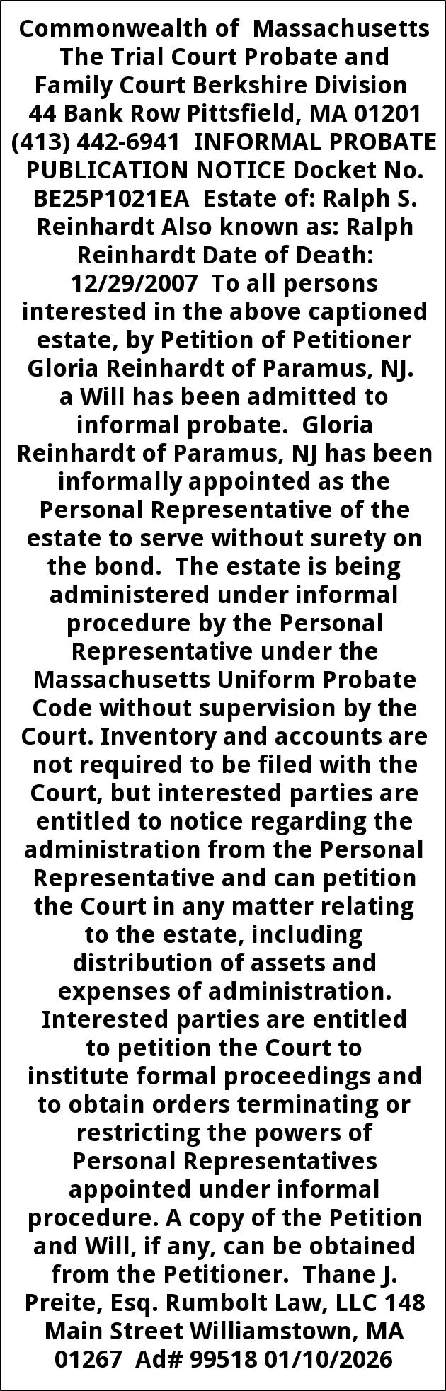 Commonwealth of Massachusetts The Trial Court Probate and Family Court Berkshire Division 44 Bank Row Pittsfield, MA 01201 (413) 442-6941 INFORMAL PROBATE PUBLICATION NOTICE Docket No. BE25P1021EA Estate of: Ralph S. Reinhardt Also known as: Ralph Reinhardt Date of Death: 12/29/2007 To all persons interested in the above captioned estate, by Petition of Petitioner Gloria Reinhardt of Paramus, NJ. a Will has been admitted to informal probate. Gloria Reinhardt of Paramus, NJ has been informally appointed as the Personal Representative of the estate to serve without surety on the bond. The estate is being administered under informal procedure by the Personal Representative under the Massachusetts Uniform Probate Code without supervision by the Court. Inventory and accounts are not required to be filed with the Court, but interested parties are entitled to notice regarding the administration from the Personal Representative and can petition the Court in any matter relating to the estate, including distribution of assets and expenses of administration. Interested parties are entitled to petition the Court to institute formal proceedings and to obtain orders terminating or restricting the powers of Personal Representatives appointed under informal procedure. A copy of the Petition and Will, if any, can be obtained from the Petitioner. Thane J. Preite, Esq. Rumbolt Law, LLC 148 Main Street Williamstown, MA 01267 Ad# 99518 01/10/2026