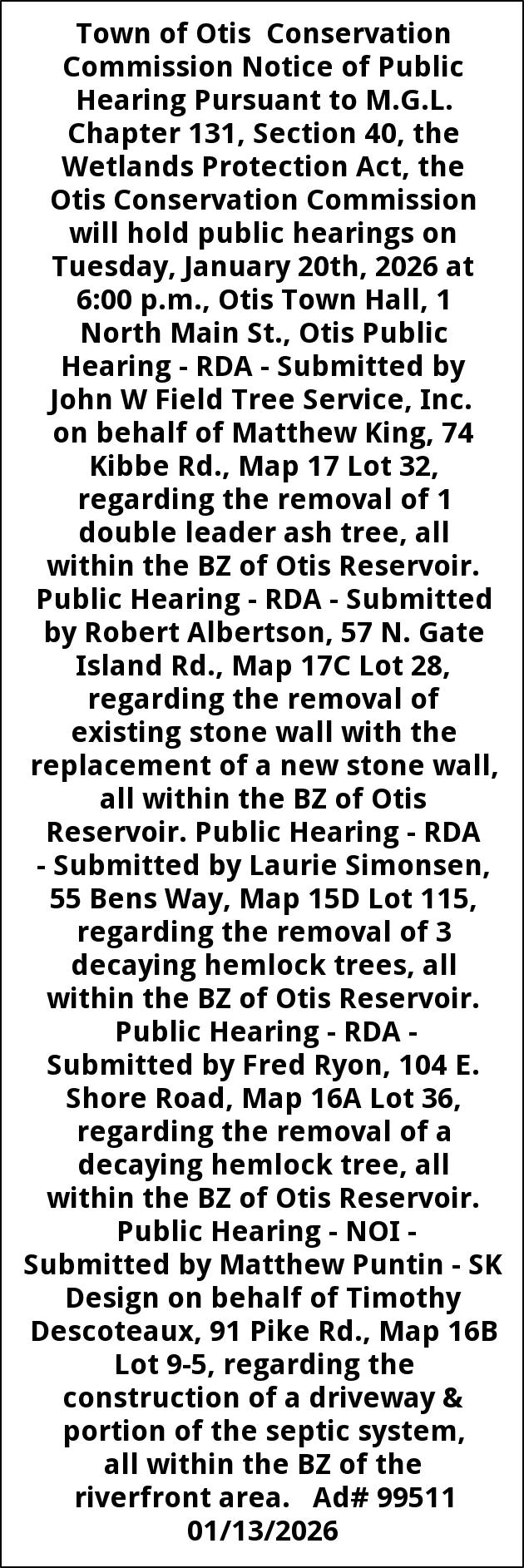 Town of Otis Conservation Commission Notice of Public Hearing Pursuant to M.G.L. Chapter 131, Section 40, the Wetlands Protection Act, the Otis Conservation Commission will hold public hearings on Tuesday, January 20th, 2026 at 6:00 p.m., Otis Town Hall, 1 North Main St., Otis Public Hearing - RDA - Submitted by John W Field Tree Service, Inc. on behalf of Matthew King, 74 Kibbe Rd., Map 17 Lot 32, regarding the removal of 1 double leader ash tree, all within the BZ of Otis Reservoir. Public Hearing - RDA - Submitted by Robert Albertson, 57 N. Gate Island Rd., Map 17C Lot 28, regarding the removal of existing stone wall with the replacement of a new stone wall, all within the BZ of Otis Reservoir. Public Hearing - RDA - Submitted by Laurie Simonsen, 55 Bens Way, Map 15D Lot 115, regarding the removal of 3 decaying hemlock trees, all within the BZ of Otis Reservoir. Public Hearing - RDA - Submitted by Fred Ryon, 104 E. Shore Road, Map 16A Lot 36, regarding the removal of a decaying hemlock tree, all within the BZ of Otis Reservoir. Public Hearing - NOI - Submitted by Matthew Puntin - SK Design on behalf of Timothy Descoteaux, 91 Pike Rd., Map 16B Lot 9-5, regarding the construction of a driveway & portion of the septic system, all within the BZ of the riverfront area. Ad# 99511 01/13/2026