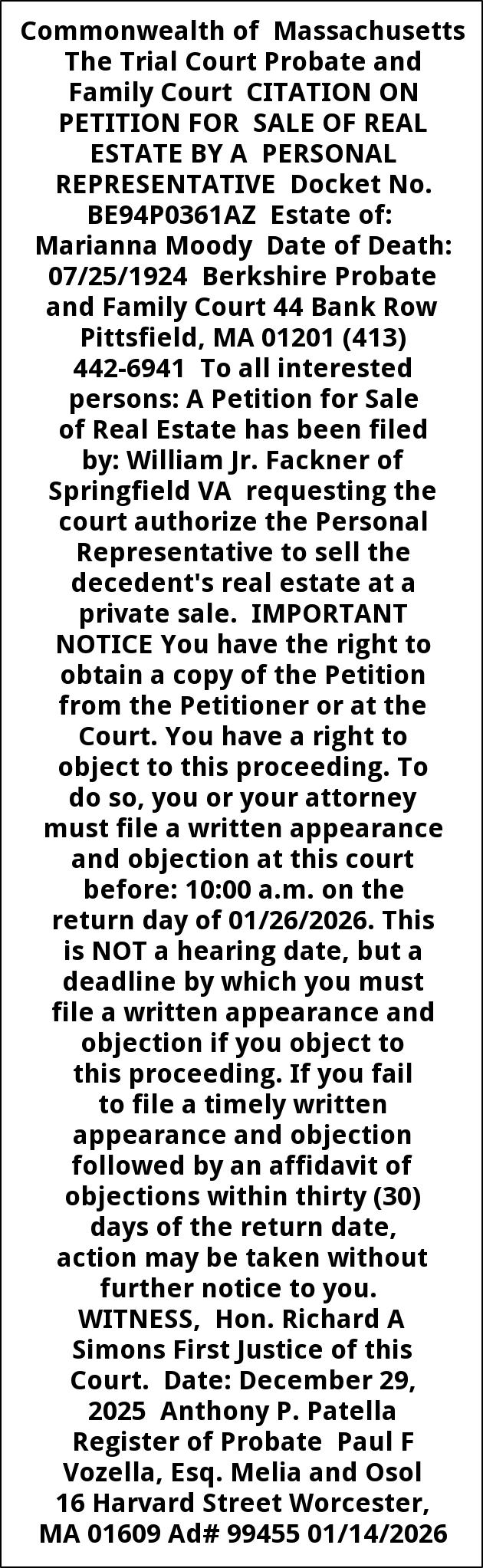 Commonwealth of Massachusetts The Trial Court Probate and Family Court CITATION ON PETITION FOR SALE OF REAL ESTATE BY A PERSONAL REPRESENTATIVE Docket No. BE94P0361AZ Estate of: Marianna Moody Date of Death: 07/25/1924 Berkshire Probate and Family Court 44 Bank Row Pittsfield, MA 01201 (413) 442-6941 To all interested persons: A Petition for Sale of Real Estate has been filed by: William Jr. Fackner of Springfield VA requesting the court authorize the Personal Representative to sell the decedent's real estate at a private sale. IMPORTANT NOTICE You have the right to obtain a copy of the Petition from the Petitioner or at the Court. You have a right to object to this proceeding. To do so, you or your attorney must file a written appearance and objection at this court before: 10:00 a.m. on the return day of 01/26/2026. This is NOT a hearing date, but a deadline by which you must file a written appearance and objection if you object to this proceeding. If you fail to file a timely written appearance and objection followed by an affidavit of objections within thirty (30) days of the return date, action may be taken without further notice to you. WITNESS, Hon. Richard A Simons First Justice of this Court. Date: December 29, 2025 Anthony P. Patella Register of Probate Paul F Vozella, Esq. Melia and Osol 16 Harvard Street Worcester, MA 01609 Ad# 99455 01/14/2026