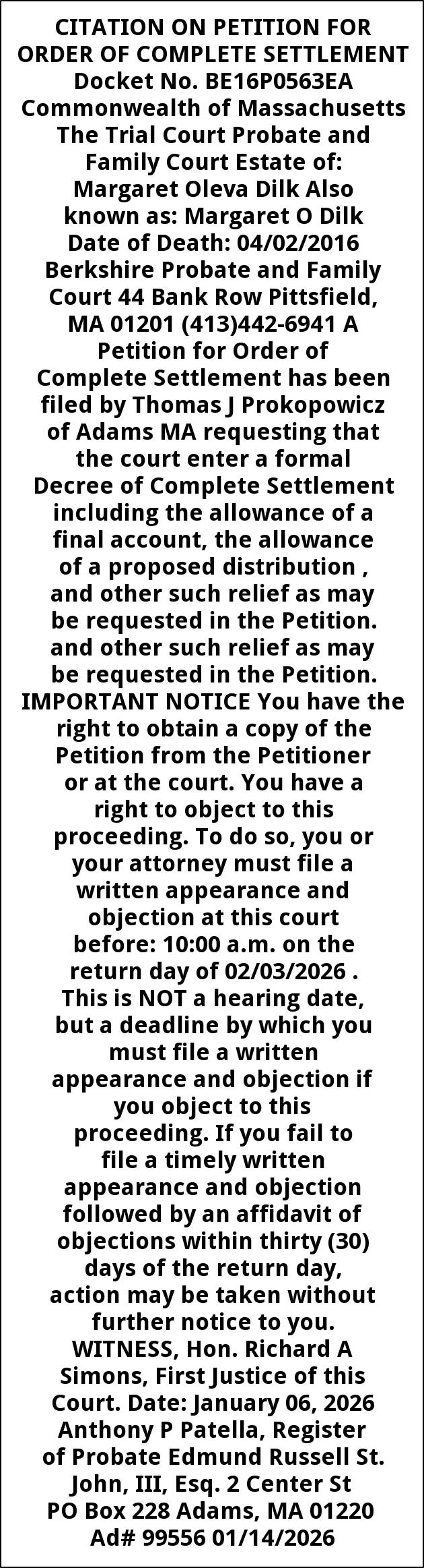 CITATION ON PETITION FOR ORDER OF COMPLETE SETTLEMENT Docket No. BE16P0563EA Commonwealth of Massachusetts The Trial Court Probate and Family Court Estate of: Margaret Oleva Dilk Also known as: Margaret O Dilk Date of Death: 04/02/2016 Berkshire Probate and Family Court 44 Bank Row Pittsfield, MA 01201 (413)442-6941 A Petition for Order of Complete Settlement has been filed by Thomas J Prokopowicz of Adams MA requesting that the court enter a formal Decree of Complete Settlement including the allowance of a final account, the allowance of a proposed distribution , and other such relief as may be requested in the Petition. and other such relief as may be requested in the Petition. IMPORTANT NOTICE You have the right to obtain a copy of the Petition from the Petitioner or at the court. You have a right to object to this proceeding. To do so, you or your attorney must file a written appearance and objection at this court before: 10:00 a.m. on the return day of 02/03/2026 . This is NOT a hearing date, but a deadline by which you must file a written appearance and objection if you object to this proceeding. If you fail to file a timely written appearance and objection followed by an affidavit of objections within thirty (30) days of the return day, action may be taken without further notice to you. WITNESS, Hon. Richard A Simons, First Justice of this Court. Date: January 06, 2026 Anthony P Patella, Register of Probate Edmund Russell St. John, III, Esq. 2 Center St PO Box 228 Adams, MA 01220 Ad# 99556 01/14/2026