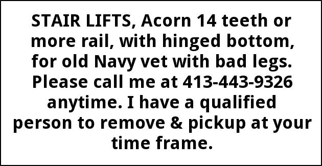 STAIR LIFTS, Acorn 14 teeth or more rail, with hinged bottom, for old Navy vet with bad legs. Please call me at 413-443-9326 anytime. I have a qualified person to remove & pickup at your time frame.