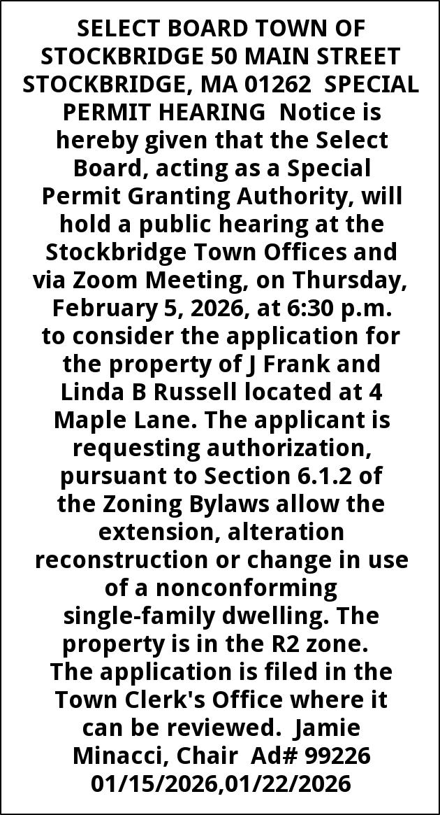 SELECT BOARD TOWN OF STOCKBRIDGE 50 MAIN STREET STOCKBRIDGE, MA 01262 SPECIAL PERMIT HEARING Notice is hereby given that the Select Board, acting as a Special Permit Granting Authority, will hold a public hearing at the Stockbridge Town Offices and via Zoom Meeting, on Thursday, February 5, 2026, at 6:30 p.m. to consider the application for the property of J Frank and Linda B Russell located at 4 Maple Lane. The applicant is requesting authorization, pursuant to Section 6.1.2 of the Zoning Bylaws allow the extension, alteration reconstruction or change in use of a nonconforming single-family dwelling. The property is in the R2 zone. The application is filed in the Town Clerk's Office where it can be reviewed. Jamie Minacci, Chair Ad# 99226 01/15/2026,01/22/2026