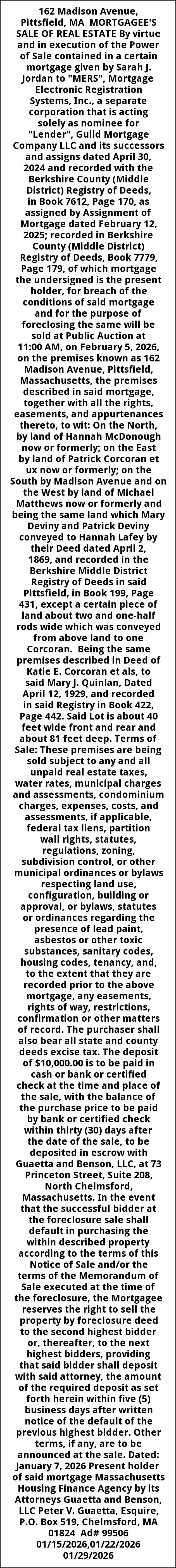 162 Madison Avenue, Pittsfield, MA MORTGAGEE'S SALE OF REAL ESTATE By virtue and in execution of the Power of Sale contained in a certain mortgage given by Sarah J. Jordan to "MERS", Mortgage Electronic Registration Systems, Inc., a separate corporation that is acting solely as nominee for "Lender", Guild Mortgage Company LLC and its successors and assigns dated April 30, 2024 and recorded with the Berkshire County (Middle District) Registry of Deeds, in Book 7612, Page 170, as assigned by Assignment of Mortgage dated February 12, 2025; recorded in Berkshire County (Middle District) Registry of Deeds, Book 7779, Page 179, of which mortgage the undersigned is the present holder, for breach of the conditions of said mortgage and for the purpose of foreclosing the same will be sold at Public Auction at 11:00 AM, on February 5, 2026, on the premises known as 162 Madison Avenue, Pittsfield, Massachusetts, the premises described in said mortgage, together with all the rights, easements, and appurtenances thereto, to wit: On the North, by land of Hannah McDonough now or formerly; on the East by land of Patrick Corcoran et ux now or formerly; on the South by Madison Avenue and on the West by land of Michael Matthews now or formerly and being the same land which Mary Deviny and Patrick Deviny conveyed to Hannah Lafey by their Deed dated April 2, 1869, and recorded in the Berkshire Middle District Registry of Deeds in said Pittsfield, in Book 199, Page 431, except a certain piece of land about two and one-half rods wide which was conveyed from above land to one Corcoran. Being the same premises described in Deed of Katie E. Corcoran et als, to said Mary J. Quinlan, Dated April 12, 1929, and recorded in said Registry in Book 422, Page 442. Said Lot is about 40 feet wide front and rear and about 81 feet deep. Terms of Sale: These premises are being sold subject to any and all unpaid real estate taxes, water rates, municipal charges and assessments, condominium charges, expenses, costs, and assessments, if applicable, federal tax liens, partition wall rights, statutes, regulations, zoning, subdivision control, or other municipal ordinances or bylaws respecting land use, configuration, building or approval, or bylaws, statutes or ordinances regarding the presence of lead paint, asbestos or other toxic substances, sanitary codes, housing codes, tenancy, and, to the extent that they are recorded prior to the above mortgage, any easements, rights of way, restrictions, confirmation or other matters of record. The purchaser shall also bear all state and county deeds excise tax. The deposit of $10,000.00 is to be paid in cash or bank or certified check at the time and place of the sale, with the balance of the purchase price to be paid by bank or certified check within thirty (30) days after the date of the sale, to be deposited in escrow with Guaetta and Benson, LLC, at 73 Princeton Street, Suite 208, North Chelmsford, Massachusetts. In the event that the successful bidder at the foreclosure sale shall default in purchasing the within described property according to the terms of this Notice of Sale and/or the terms of the Memorandum of Sale executed at the time of the foreclosure, the Mortgagee reserves the right to sell the property by foreclosure deed to the second highest bidder or, thereafter, to the next highest bidders, providing that said bidder shall deposit with said attorney, the amount of the required deposit as set forth herein within five (5) business days after written notice of the default of the previous highest bidder. Other terms, if any, are to be announced at the sale. Dated: January 7, 2026 Present holder of said mortgage Massachusetts Housing Finance Agency by its Attorneys Guaetta and Benson, LLC Peter V. Guaetta, Esquire, P.O. Box 519, Chelmsford, MA 01824 Ad# 99506 01/15/2026,01/22/2026 01/29/2026