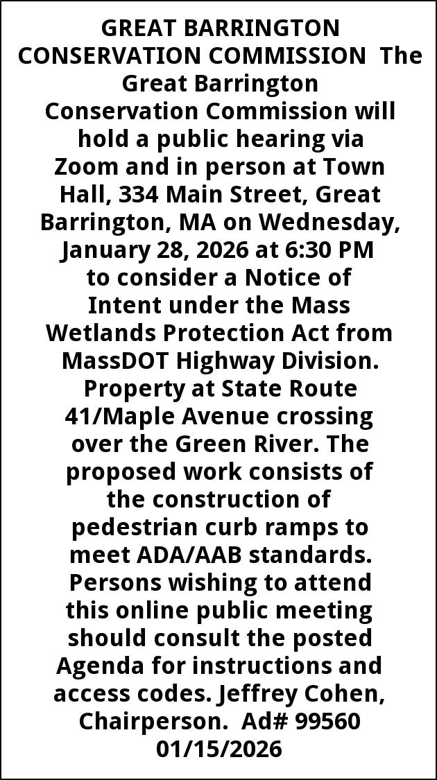 GREAT BARRINGTON CONSERVATION COMMISSION The Great Barrington Conservation Commission will hold a public hearing via Zoom and in person at Town Hall, 334 Main Street, Great Barrington, MA on Wednesday, January 28, 2026 at 6:30 PM to consider a Notice of Intent under the Mass Wetlands Protection Act from MassDOT Highway Division. Property at State Route 41/Maple Avenue crossing over the Green River. The proposed work consists of the construction of pedestrian curb ramps to meet ADA/AAB standards. Persons wishing to attend this online public meeting should consult the posted Agenda for instructions and access codes. Jeffrey Cohen, Chairperson. Ad# 99560 01/15/2026