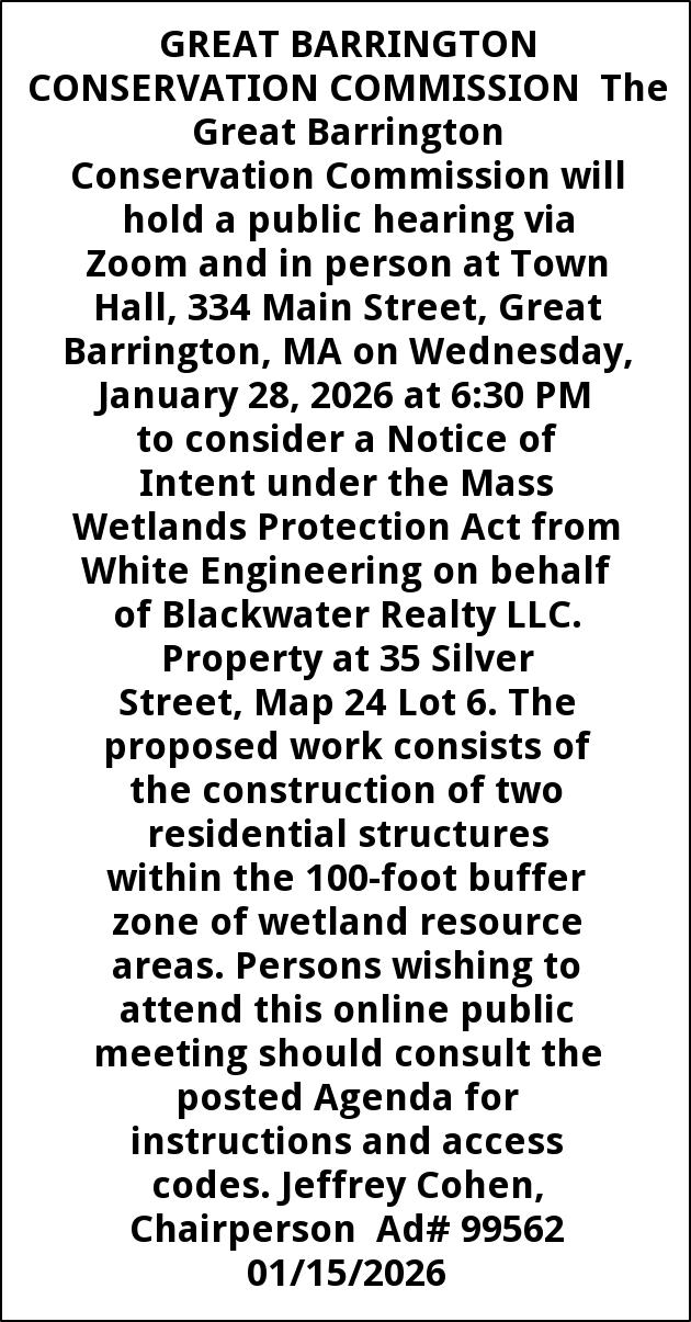 GREAT BARRINGTON CONSERVATION COMMISSION The Great Barrington Conservation Commission will hold a public hearing via Zoom and in person at Town Hall, 334 Main Street, Great Barrington, MA on Wednesday, January 28, 2026 at 6:30 PM to consider a Notice of Intent under the Mass Wetlands Protection Act from White Engineering on behalf of Blackwater Realty LLC. Property at 35 Silver Street, Map 24 Lot 6. The proposed work consists of the construction of two residential structures within the 100-foot buffer zone of wetland resource areas. Persons wishing to attend this online public meeting should consult the posted Agenda for instructions and access codes. Jeffrey Cohen, Chairperson Ad# 99562 01/15/2026