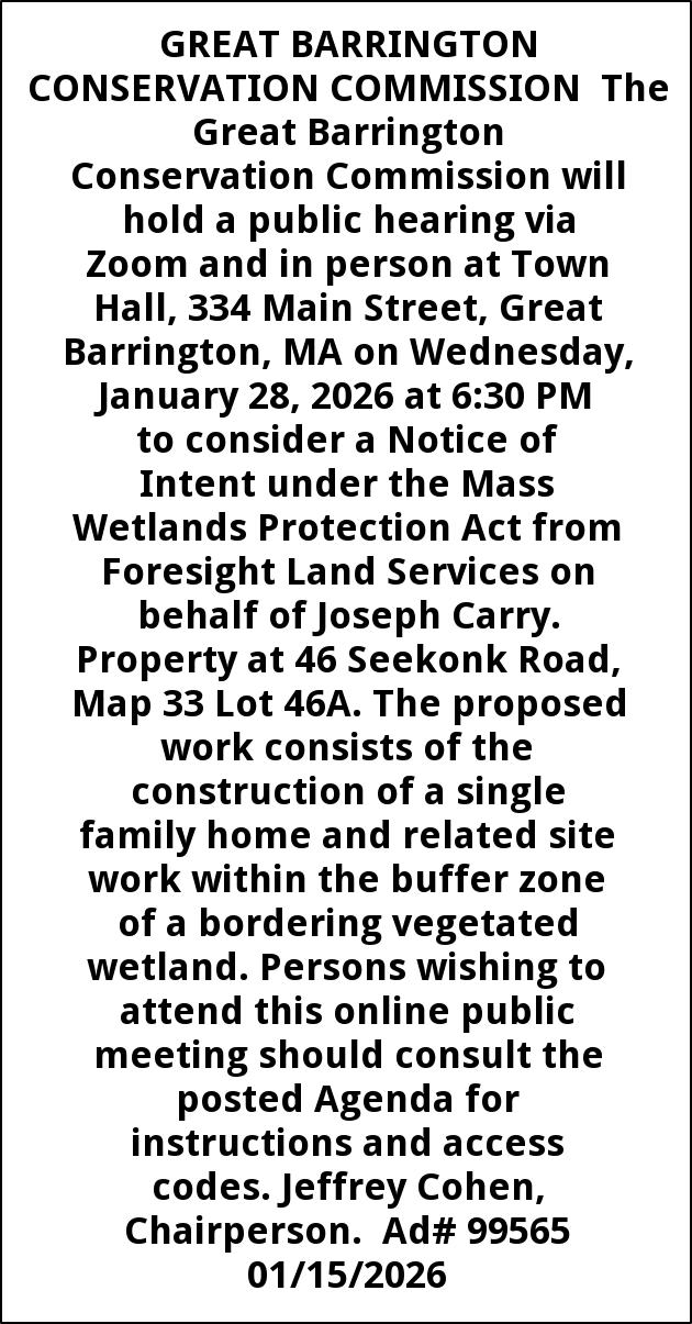 GREAT BARRINGTON CONSERVATION COMMISSION The Great Barrington Conservation Commission will hold a public hearing via Zoom and in person at Town Hall, 334 Main Street, Great Barrington, MA on Wednesday, January 28, 2026 at 6:30 PM to consider a Notice of Intent under the Mass Wetlands Protection Act from Foresight Land Services on behalf of Joseph Carry. Property at 46 Seekonk Road, Map 33 Lot 46A. The proposed work consists of the construction of a single family home and related site work within the buffer zone of a bordering vegetated wetland. Persons wishing to attend this online public meeting should consult the posted Agenda for instructions and access codes. Jeffrey Cohen, Chairperson. Ad# 99565 01/15/2026