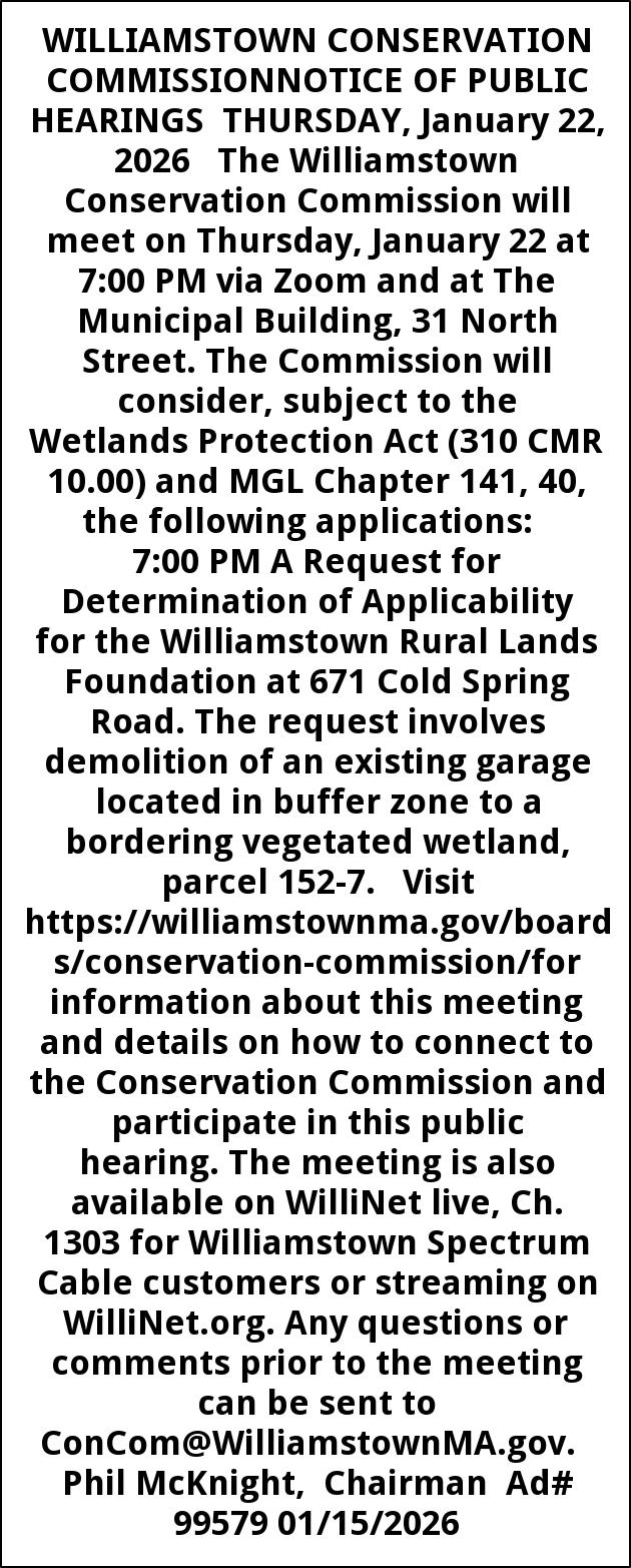 WILLIAMSTOWN CONSERVATION COMMISSIONNOTICE OF PUBLIC HEARINGS THURSDAY, January 22, 2026 The Williamstown Conservation Commission will meet on Thursday, January 22 at 7:00 PM via Zoom and at The Municipal Building, 31 North Street. The Commission will consider, subject to the Wetlands Protection Act (310 CMR 10.00) and MGL Chapter 141, 40, the following applications: 7:00 PM A Request for Determination of Applicability for the Williamstown Rural Lands Foundation at 671 Cold Spring Road. The request involves demolition of an existing garage located in buffer zone to a bordering vegetated wetland, parcel 152-7. Visit https://williamstownma.gov/boards/conservation-commission/for information about this meeting and details on how to connect to the Conservation Commission and participate in this public hearing. The meeting is also available on WilliNet live, Ch. 1303 for Williamstown Spectrum Cable customers or streaming on WilliNet.org. Any questions or comments prior to the meeting can be sent to ConCom@WilliamstownMA.gov. Phil McKnight, Chairman Ad# 99579 01/15/2026