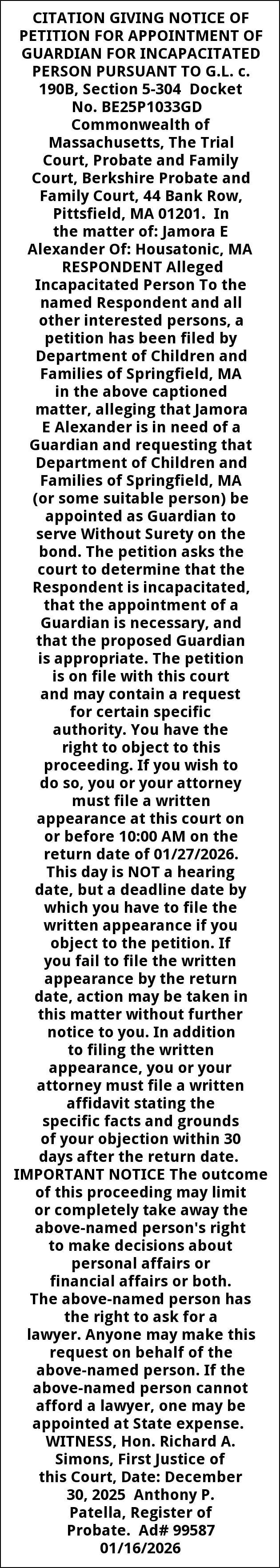 CITATION GIVING NOTICE OF PETITION FOR APPOINTMENT OF GUARDIAN FOR INCAPACITATED PERSON PURSUANT TO G.L. c. 190B, Section 5-304 Docket No. BE25P1033GD Commonwealth of Massachusetts, The Trial Court, Probate and Family Court, Berkshire Probate and Family Court, 44 Bank Row, Pittsfield, MA 01201. In the matter of: Jamora E Alexander Of: Housatonic, MA RESPONDENT Alleged Incapacitated Person To the named Respondent and all other interested persons, a petition has been filed by Department of Children and Families of Springfield, MA in the above captioned matter, alleging that Jamora E Alexander is in need of a Guardian and requesting that Department of Children and Families of Springfield, MA (or some suitable person) be appointed as Guardian to serve Without Surety on the bond. The petition asks the court to determine that the Respondent is incapacitated, that the appointment of a Guardian is necessary, and that the proposed Guardian is appropriate. The petition is on file with this court and may contain a request for certain specific authority. You have the right to object to this proceeding. If you wish to do so, you or your attorney must file a written appearance at this court on or before 10:00 AM on the return date of 01/27/2026. This day is NOT a hearing date, but a deadline date by which you have to file the written appearance if you object to the petition. If you fail to file the written appearance by the return date, action may be taken in this matter without further notice to you. In addition to filing the written appearance, you or your attorney must file a written affidavit stating the specific facts and grounds of your objection within 30 days after the return date. IMPORTANT NOTICE The outcome of this proceeding may limit or completely take away the above-named person's right to make decisions about personal affairs or financial affairs or both. The above-named person has the right to ask for a lawyer. Anyone may make this request on behalf of the above-named person. If the above-named person cannot afford a lawyer, one may be appointed at State expense. WITNESS, Hon. Richard A. Simons, First Justice of this Court, Date: December 30, 2025 Anthony P. Patella, Register of Probate. Ad# 99587 01/16/2026