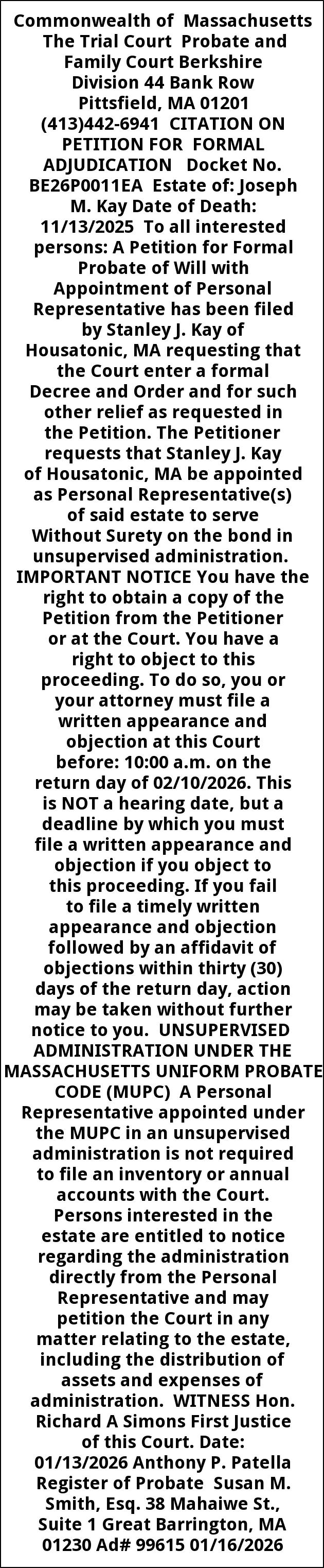 Commonwealth of Massachusetts The Trial Court Probate and Family Court Berkshire Division 44 Bank Row Pittsfield, MA 01201 (413)442-6941 CITATION ON PETITION FOR FORMAL ADJUDICATION Docket No. BE26P0011EA Estate of: Joseph M. Kay Date of Death: 11/13/2025 To all interested persons: A Petition for Formal Probate of Will with Appointment of Personal Representative has been filed by Stanley J. Kay of Housatonic, MA requesting that the Court enter a formal Decree and Order and for such other relief as requested in the Petition. The Petitioner requests that Stanley J. Kay of Housatonic, MA be appointed as Personal Representative(s) of said estate to serve Without Surety on the bond in unsupervised administration. IMPORTANT NOTICE You have the right to obtain a copy of the Petition from the Petitioner or at the Court. You have a right to object to this proceeding. To do so, you or your attorney must file a written appearance and objection at this Court before: 10:00 a.m. on the return day of 02/10/2026. This is NOT a hearing date, but a deadline by which you must file a written appearance and objection if you object to this proceeding. If you fail to file a timely written appearance and objection followed by an affidavit of objections within thirty (30) days of the return day, action may be taken without further notice to you. UNSUPERVISED ADMINISTRATION UNDER THE MASSACHUSETTS UNIFORM PROBATE CODE (MUPC) A Personal Representative appointed under the MUPC in an unsupervised administration is not required to file an inventory or annual accounts with the Court. Persons interested in the estate are entitled to notice regarding the administration directly from the Personal Representative and may petition the Court in any matter relating to the estate, including the distribution of assets and expenses of administration. WITNESS Hon. Richard A Simons First Justice of this Court. Date: 01/13/2026 Anthony P. Patella Register of Probate Susan M. Smith, Esq. 38 Mahaiwe St., Suite 1 Great Barrington, MA 01230 Ad# 99615 01/16/2026
