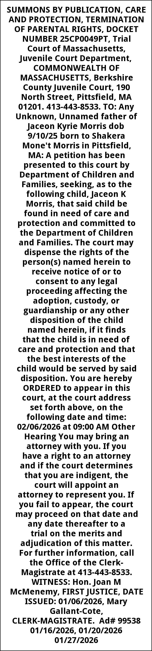 SUMMONS BY PUBLICATION, CARE AND PROTECTION, TERMINATION OF PARENTAL RIGHTS, DOCKET NUMBER 25CP0049PT, Trial Court of Massachusetts, Juvenile Court Department, COMMONWEALTH OF MASSACHUSETTS, Berkshire County Juvenile Court, 190 North Street, Pittsfield, MA 01201. 413-443-8533. TO: Any Unknown, Unnamed father of Jaceon Kyrie Morris dob 9/10/25 born to Shakera Mone't Morris in Pittsfield, MA: A petition has been presented to this court by Department of Children and Families, seeking, as to the following child, Jaceon K Morris, that said child be found in need of care and protection and committed to the Department of Children and Families. The court may dispense the rights of the person(s) named herein to receive notice of or to consent to any legal proceeding affecting the adoption, custody, or guardianship or any other disposition of the child named herein, if it finds that the child is in need of care and protection and that the best interests of the child would be served by said disposition. You are hereby ORDERED to appear in this court, at the court address set forth above, on the following date and time: 02/06/2026 at 09:00 AM Other Hearing You may bring an attorney with you. If you have a right to an attorney and if the court determines that you are indigent, the court will appoint an attorney to represent you. If you fail to appear, the court may proceed on that date and any date thereafter to a trial on the merits and adjudication of this matter. For further information, call the Office of the Clerk- Magistrate at 413-443-8533. WITNESS: Hon. Joan M McMenemy, FIRST JUSTICE, DATE ISSUED: 01/06/2026, Mary Gallant-Cote, CLERK-MAGISTRATE. Ad# 99538 01/16/2026, 01/20/2026 01/27/2026
