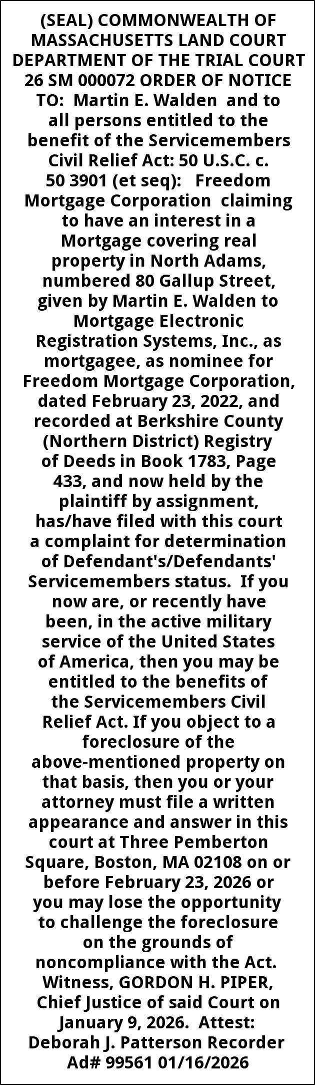 (SEAL) COMMONWEALTH OF MASSACHUSETTS LAND COURT DEPARTMENT OF THE TRIAL COURT 26 SM 000072 ORDER OF NOTICE TO: Martin E. Walden and to all persons entitled to the benefit of the Servicemembers Civil Relief Act: 50 U.S.C. c. 50 3901 (et seq): Freedom Mortgage Corporation claiming to have an interest in a Mortgage covering real property in North Adams, numbered 80 Gallup Street, given by Martin E. Walden to Mortgage Electronic Registration Systems, Inc., as mortgagee, as nominee for Freedom Mortgage Corporation, dated February 23, 2022, and recorded at Berkshire County (Northern District) Registry of Deeds in Book 1783, Page 433, and now held by the plaintiff by assignment, has/have filed with this court a complaint for determination of Defendant's/Defendants' Servicemembers status. If you now are, or recently have been, in the active military service of the United States of America, then you may be entitled to the benefits of the Servicemembers Civil Relief Act. If you object to a foreclosure of the above-mentioned property on that basis, then you or your attorney must file a written appearance and answer in this court at Three Pemberton Square, Boston, MA 02108 on or before February 23, 2026 or you may lose the opportunity to challenge the foreclosure on the grounds of noncompliance with the Act. Witness, GORDON H. PIPER, Chief Justice of said Court on January 9, 2026. Attest: Deborah J. Patterson Recorder Ad# 99561 01/16/2026