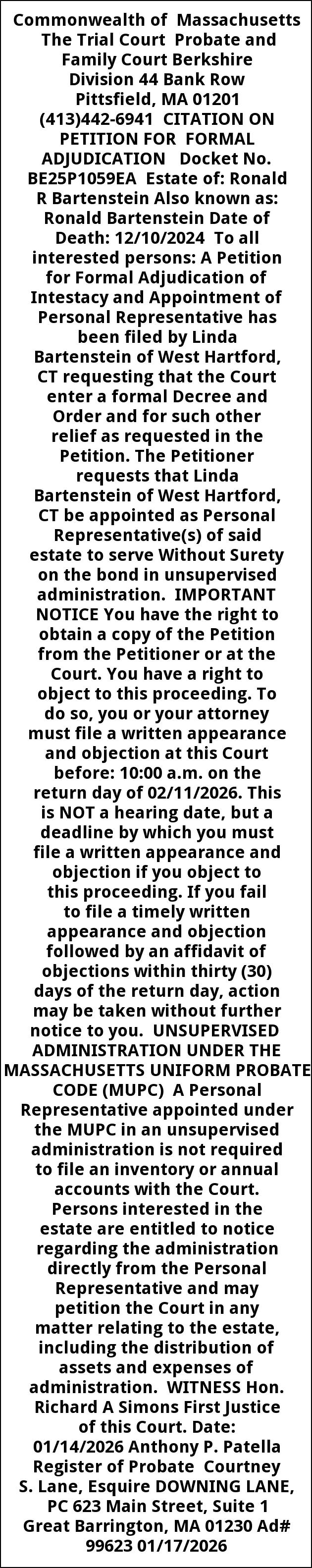 Commonwealth of Massachusetts The Trial Court Probate and Family Court Berkshire Division 44 Bank Row Pittsfield, MA 01201 (413)442-6941 CITATION ON PETITION FOR FORMAL ADJUDICATION Docket No. BE25P1059EA Estate of: Ronald R Bartenstein Also known as: Ronald Bartenstein Date of Death: 12/10/2024 To all interested persons: A Petition for Formal Adjudication of Intestacy and Appointment of Personal Representative has been filed by Linda Bartenstein of West Hartford, CT requesting that the Court enter a formal Decree and Order and for such other relief as requested in the Petition. The Petitioner requests that Linda Bartenstein of West Hartford, CT be appointed as Personal Representative(s) of said estate to serve Without Surety on the bond in unsupervised administration. IMPORTANT NOTICE You have the right to obtain a copy of the Petition from the Petitioner or at the Court. You have a right to object to this proceeding. To do so, you or your attorney must file a written appearance and objection at this Court before: 10:00 a.m. on the return day of 02/11/2026. This is NOT a hearing date, but a deadline by which you must file a written appearance and objection if you object to this proceeding. If you fail to file a timely written appearance and objection followed by an affidavit of objections within thirty (30) days of the return day, action may be taken without further notice to you. UNSUPERVISED ADMINISTRATION UNDER THE MASSACHUSETTS UNIFORM PROBATE CODE (MUPC) A Personal Representative appointed under the MUPC in an unsupervised administration is not required to file an inventory or annual accounts with the Court. Persons interested in the estate are entitled to notice regarding the administration directly from the Personal Representative and may petition the Court in any matter relating to the estate, including the distribution of assets and expenses of administration. WITNESS Hon. Richard A Simons First Justice of this Court. Date: 01/14/2026 Anthony P. Patella Register of Probate Courtney S. Lane, Esquire DOWNING LANE, PC 623 Main Street, Suite 1 Great Barrington, MA 01230 Ad# 99623 01/17/2026