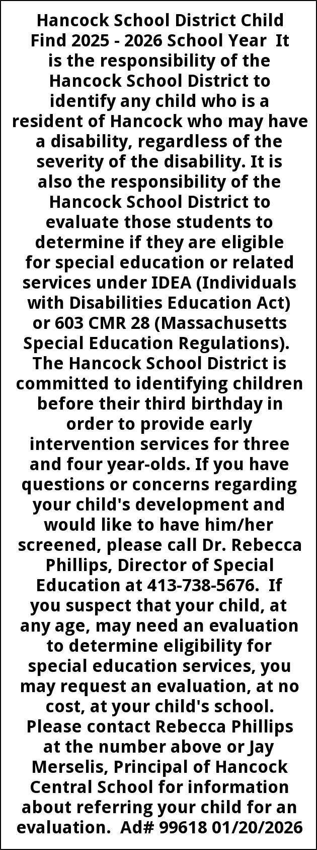 Hancock School District Child Find 2025 - 2026 School Year It is the responsibility of the Hancock School District to identify any child who is a resident of Hancock who may have a disability, regardless of the severity of the disability. It is also the responsibility of the Hancock School District to evaluate those students to determine if they are eligible for special education or related services under IDEA (Individuals with Disabilities Education Act) or 603 CMR 28 (Massachusetts Special Education Regulations). The Hancock School District is committed to identifying children before their third birthday in order to provide early intervention services for three and four year-olds. If you have questions or concerns regarding your child's development and would like to have him/her screened, please call Dr. Rebecca Phillips, Director of Special Education at 413-738-5676. If you suspect that your child, at any age, may need an evaluation to determine eligibility for special education services, you may request an evaluation, at no cost, at your child's school. Please contact Rebecca Phillips at the number above or Jay Merselis, Principal of Hancock Central School for information about referring your child for an evaluation. Ad# 99618 01/20/2026