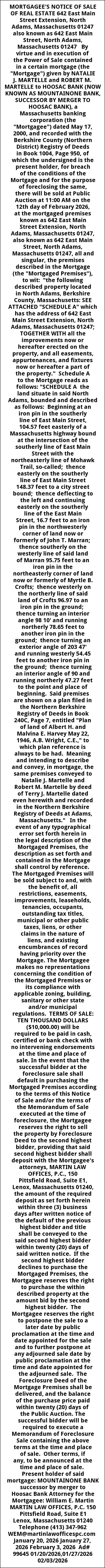 MORTGAGEE'S NOTICE OF SALE OF REAL ESTATE 642 East Main Street Extension, North Adams, Massachusetts 01247 also known as 642 East Main Street, North Adams, Massachusetts 01247 By virtue and in execution of the Power of Sale contained in a certain mortgage (the "Mortgage") given by NATALIE J. MARTELLE and ROBERT M. MARTELLE to HOOSAC BANK (NOW KNOWN AS MOUNTAINONE BANK, SUCCESSOR BY MERGER TO HOOSAC BANK), a Massachusetts banking corporation (the "Mortgagee") dated May 17, 2000, and recorded with the Berkshire County (Northern District) Registry of Deeds in Book 1004, Page 950, of which the undersigned is the present holder, for breach of the conditions of the Mortgage and for the purpose of foreclosing the same, there will be sold at Public Auction at 11:00 AM on the 12th day of February 2026, at the mortgaged premises known as 642 East Main Street Extension, North Adams, Massachusetts 01247, also known as 642 East Main Street, North Adams, Massachusetts 01247, all and singular, the premises described in the Mortgage (the "Mortgaged Premises"), to wit: "the following described property located in North Adams, Berkshire County, Massachusetts: SEE ATTACHED "SCHEDULE A" which has the address of 642 East Main Street Extension, North Adams, Massachusetts 01247; TOGETHER WITH all the improvements now or hereafter erected on the property, and all easements, appurtenances, and fixtures now or hereafter a part of the property." Schedule A to the Mortgage reads as follows: "SCHEDULE A the land situate in said North Adams, bounded and described as follows: Beginning at an iron pin in the southerly line of East Main Street, 104.57 feet easterly of a Massachusetts highway bound at the intersection of the southerly line of East Main Street with the northeasterly line of Mohawk Trail, so-called; thence easterly on the southerly line of East Main Street 148.37 feet to a city street bound; thence deflecting to the left and continuing easterly on the southerly line of the East Main Street, 16.7 feet to an iron pin in the northwesterly corner of land now or formerly of John T. Marran; thence southerly on the westerly line of said land of Marran 95.75 feet to an iron pin in the northeasterly corner of land now or formerly of Myrtle B. Crofts; thence westerly on the northerly line of said land of Crofts 96.97 to an iron pin in the ground; thence turning an interior angle 98 10' and running northerly 78.65 feet to another iron pin in the ground; thence turning an exterior angle of 203 47' and running westerly 54.45 feet to another iron pin in the ground; thence turning an interior angle of 90 and running northerly 47.27 feet to the point and place of beginning. Said premises are shown on a plan filed in the Northern Berkshire Registry of Deeds in Book 240C, Page 7, entitled "Plan of land of Albert H. and Malvina E. Harvey May 22, 1946, A.B. Wright, C.E.," to which plan reference is always to be had. Meaning and intending to describe and convey, in mortgage, the same premises conveyed to Natalie J. Martelle and Robert M. Martelle by deed of Terry J. Martelle dated even herewith and recorded in the Northern Berkshire Registry of Deeds at Adams, Massachusetts." In the event of any typographical error set forth herein in the legal description of the Mortgaged Premises, the description as set forth and contained in the Mortgage shall control by reference. The Mortgaged Premises will be sold subject to and, with the benefit of, all restrictions, easements, improvements, leaseholds, tenancies, occupants, outstanding tax titles, municipal or other public taxes, liens, or other claims in the nature of liens, and existing encumbrances of record having priority over the Mortgage. The Mortgagee makes no representations concerning the condition of the Mortgaged Premises or its compliance with applicable zoning, building, sanitary or other state and/or municipal regulations. TERMS OF SALE: TEN THOUSAND DOLLARS ($10,000.00) will be required to be paid in cash, certified or bank check with no intervening endorsements at the time and place of sale. In the event that the successful bidder at the foreclosure sale shall default in purchasing the Mortgaged Premises according to the terms of this Notice of Sale and/or the terms of the Memorandum of Sale executed at the time of foreclosure, the Mortgagee reserves the right to sell the property by Foreclosure Deed to the second highest bidder, providing that said second highest bidder shall deposit with the Mortgagee's attorneys, MARTIN LAW OFFICES, P.C., 150 Pittsfield Road, Suite E1, Lenox, Massachusetts 01240, the amount of the required deposit as set forth herein within three (3) business days after written notice of the default of the previous highest bidder and title shall be conveyed to the said second highest bidder within twenty (20) days of said written notice. If the second highest bidder declines to purchase the Mortgaged Premises, the Mortgagee reserves the right to purchase the within described property at the amount bid by the second highest bidder. The Mortgagee reserves the right to postpone the sale to a later date by public proclamation at the time and date appointed for the sale and to further postpone at any adjourned sale date by public proclamation at the time and date appointed for the adjourned sale. The Foreclosure Deed of the Mortgage Premises shall be delivered, and the balance of the purchase price paid within twenty (20) days of the Public Auction. The successful bidder will be required to execute a Memorandum of Foreclosure Sale containing the above terms at the time and place of sale. Other terms, if any, to be announced at the time and place of sale. Present holder of said mortgage: MOUNTAINONE BANK successor by merger to Hoosac Bank Attorney for the Mortgagee: William E. Martin MARTIN LAW OFFICES, P.C. 150 Pittsfield Road, Suite E1 Lenox, Massachusetts 01240 Telephone (413) 347-962 WEM@martinlawofficespc.com January 20, 2026 January 27, 2026 Februar