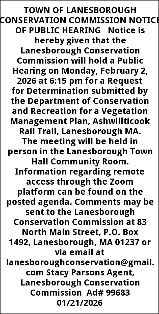 TOWN OF LANESBOROUGH CONSERVATION COMMISSION NOTICE OF PUBLIC HEARING Notice is hereby given that the Lanesborough Conservation Commission will hold a Public Hearing on Monday, February 2, 2026 at 6:15 pm for a Request for Determination submitted by the Department of Conservation and Recreation for a Vegetation Management Plan, Ashwillticook Rail Trail, Lanesborough MA. The meeting will be held in person in the Lanesborough Town Hall Community Room. Information regarding remote access through the Zoom platform can be found on the posted agenda. Comments may be sent to the Lanesborough Conservation Commission at 83 North Main Street, P.O. Box 1492, Lanesborough, MA 01237 or via email at lanesboroughconservation@gmail.com Stacy Parsons Agent, Lanesborough Conservation Commission Ad# 99683 01/21/2026
