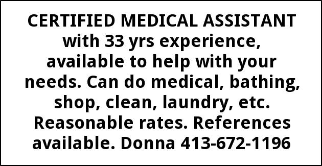 CERTIFIED MEDICAL ASSISTANT with 33 yrs experience, available to help with your needs. Can do medical, bathing, shop, clean, laundry, etc. Reasonable rates. References available. Donna 413-672-1196