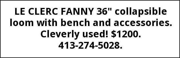 LE CLERC FANNY 36" collapsible loom with bench and accessories. Cleverly used! $1200. 413-274-5028.